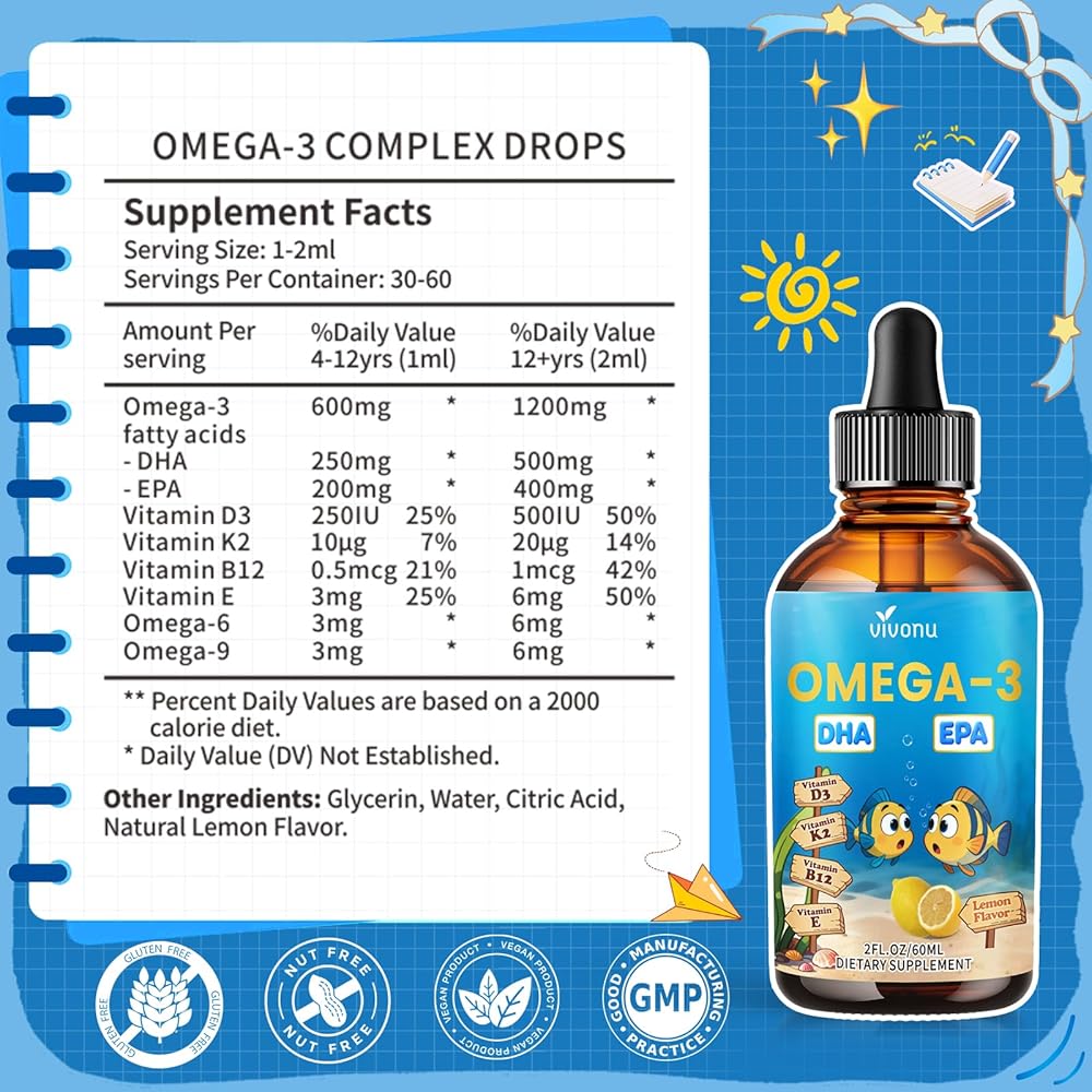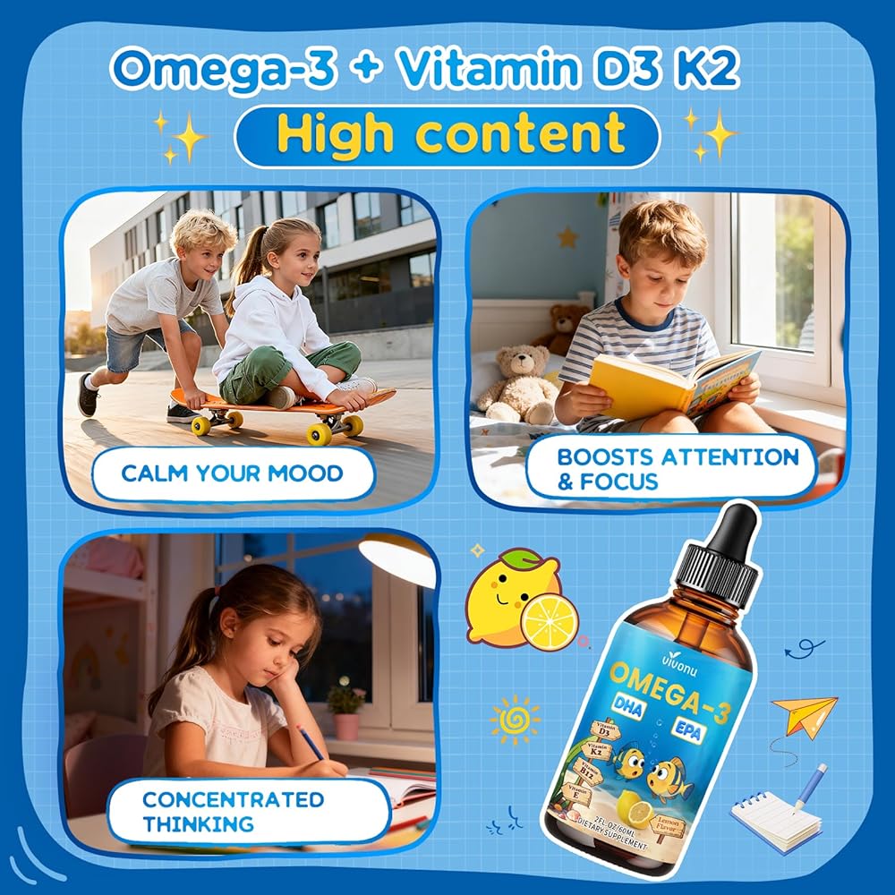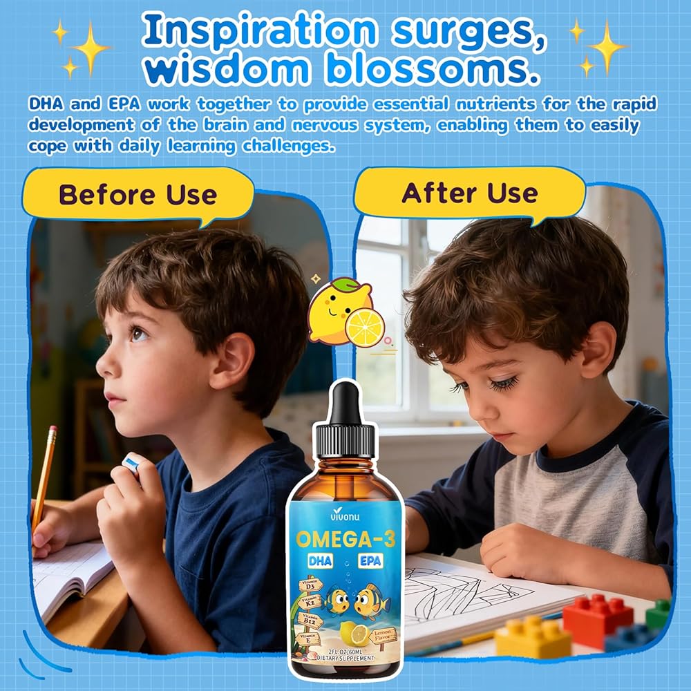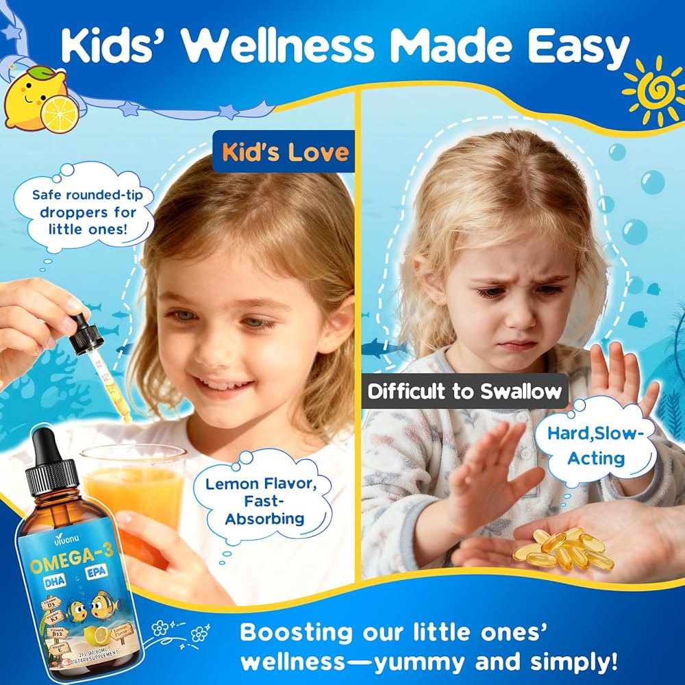 BRAIN & VISION SUPPORT FOR KIDS: VivoNu omega‑3 supplements for children contain essential fatty acids including omega‑3, omega‑6 and omega‑9, which help maintain brain function, focus and healthy eyesight. Specially made for developing minds, these DHA and EPA omega‑3 drops support your child's overall development.