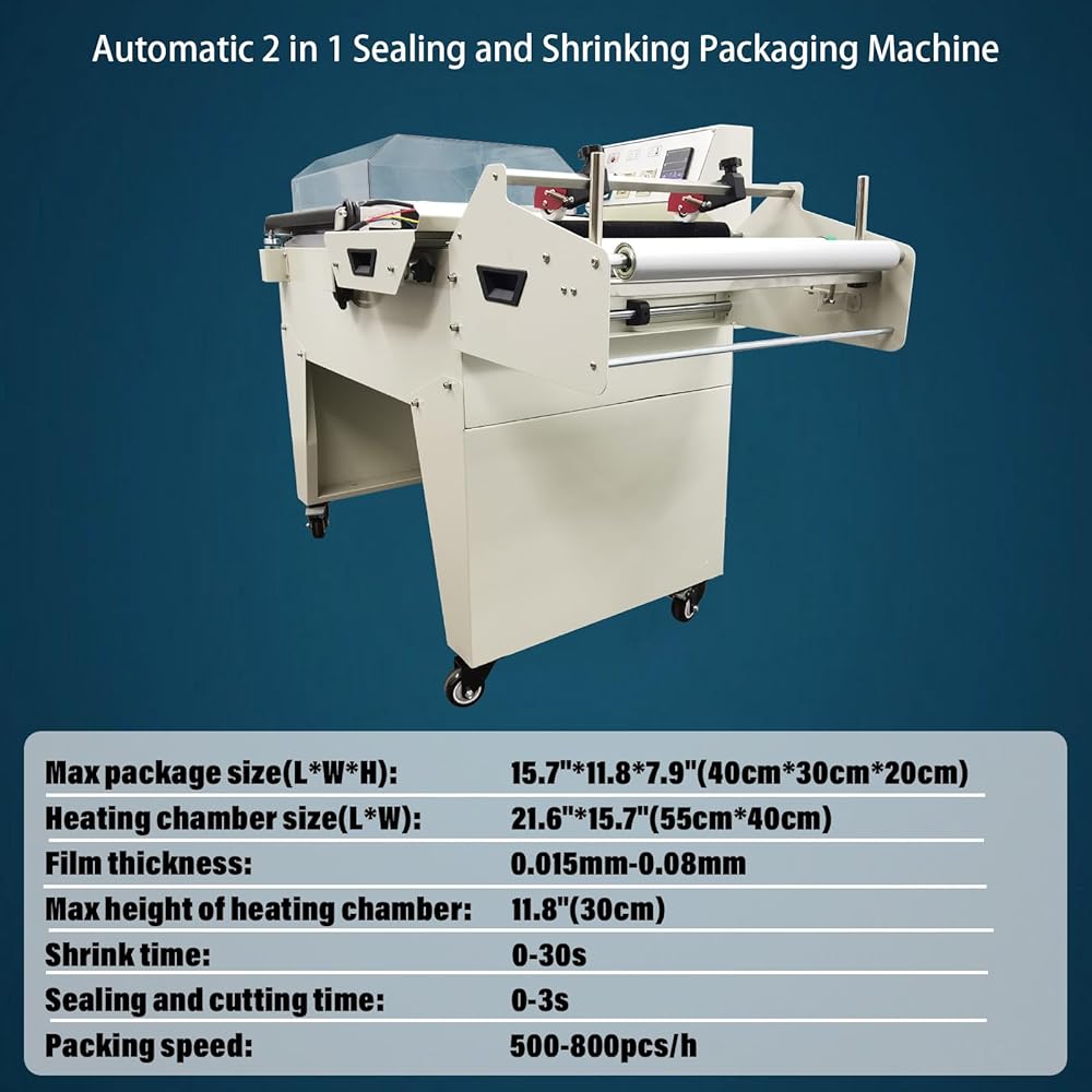 Main Data: Length of shrink film: ≤15.7"(40cm), Max package size(L*W*H): 15.7"*11.8*7.9"(40cm*30cm*20cm), Heating chamber size(L*W): 21.6"*15.7"(55cm*40cm), Film thickness: 0.015mm-0.08mm, Max height of heating chamber: 11.8"(30cm), Shrink time: 0-30s, Sealing and cutting time: 0-3s, Packing speed: 500-800pcs/h