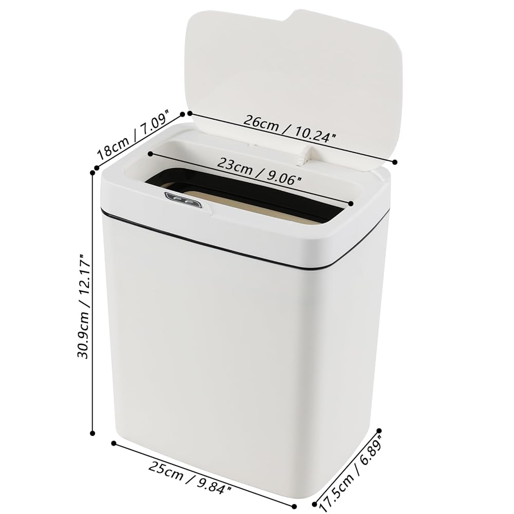 15 liters/4 gallon bathroom trash can is 10.24"L x 7.09"W x 12.17"H, need to be placed two AA batteries by yourself, save energy design, allow for long-term usage without changing betteries frequently
