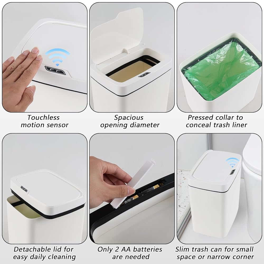 The smart garbage can is waterproof and moisture-free, slim figure, fits well in bathroom or other small space, internal black collar is the key to conceal the bag, keep the bin has a decent performance, separable top lid is beneficial for daily cleaning