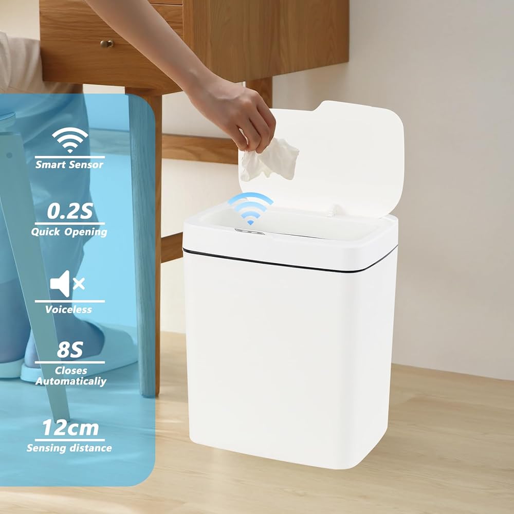 0.2 seconds infrared motion sensor to release the lid wisely and quickly, 8 seconds delay closed time for fulfilling garbage disposal, protect hands from compression, seamless lid can be quietly close, trapping odors inside while without making noise, perfect for bedroom, office, study
