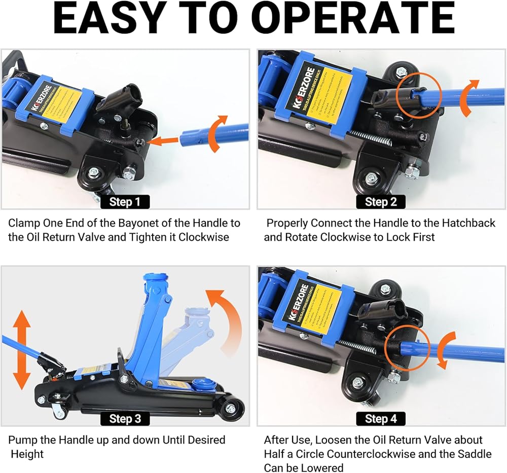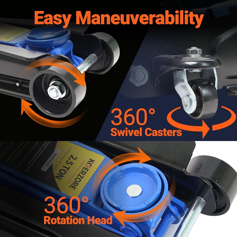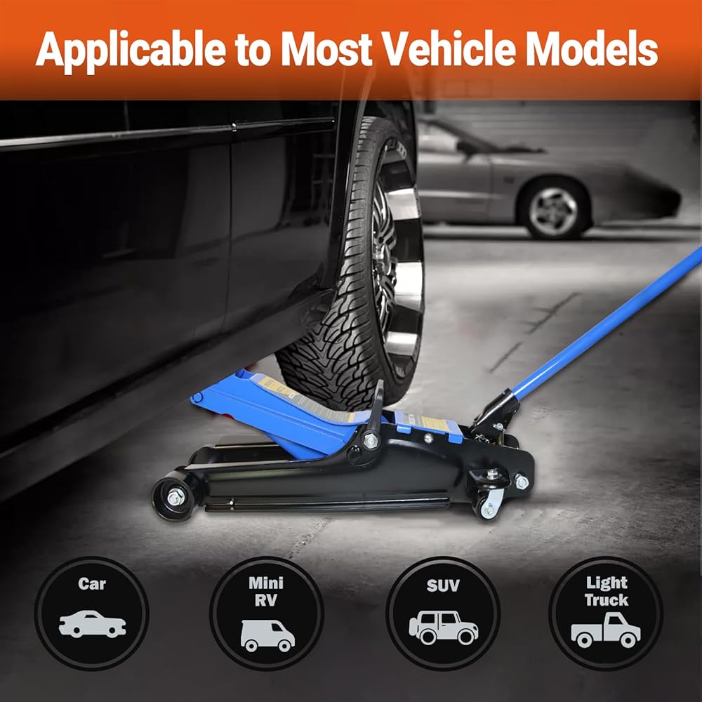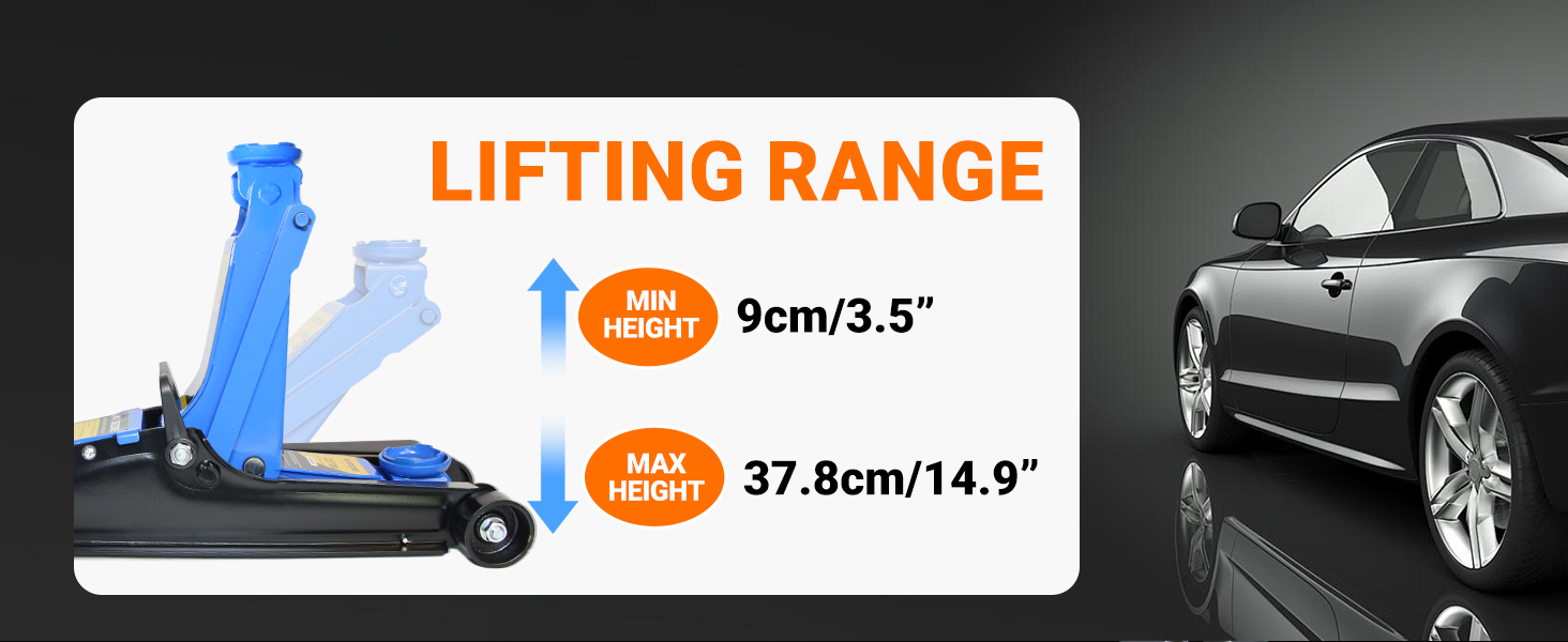 【2.5-Ton (5500 Lbs) Heavy-Duty Lifting Power】 KOERZORE floor jack lifts sedans, SUVs, and light trucks effortlessly. With 3.4"-15.2" height range , it clears low-profile sports cars while reaching full-size pickups. Ideal for tire changes, brake jobs, or suspension repairs.
