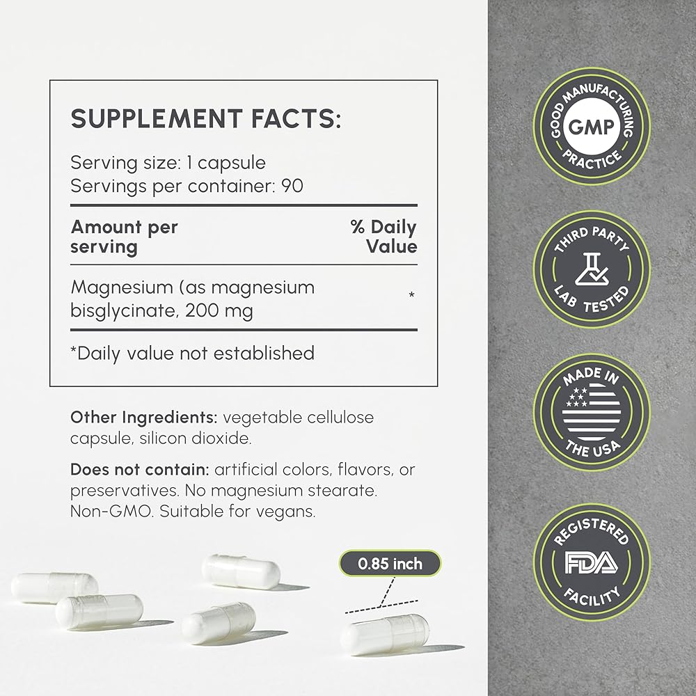 MAXIMUM ABSORPTION BISGLYCINATE FORM: Our Magnesium is formulated as a pure Chelated Bisglycinate, the most bioavailable form of this essential mineral. Unlike standard magnesium oxide, our 200mg high-absorption formula ensures your body effectively utilizes every milligram for optimal health.
