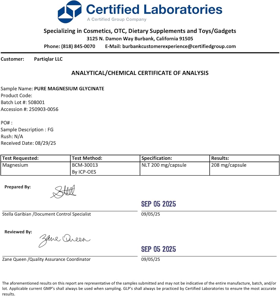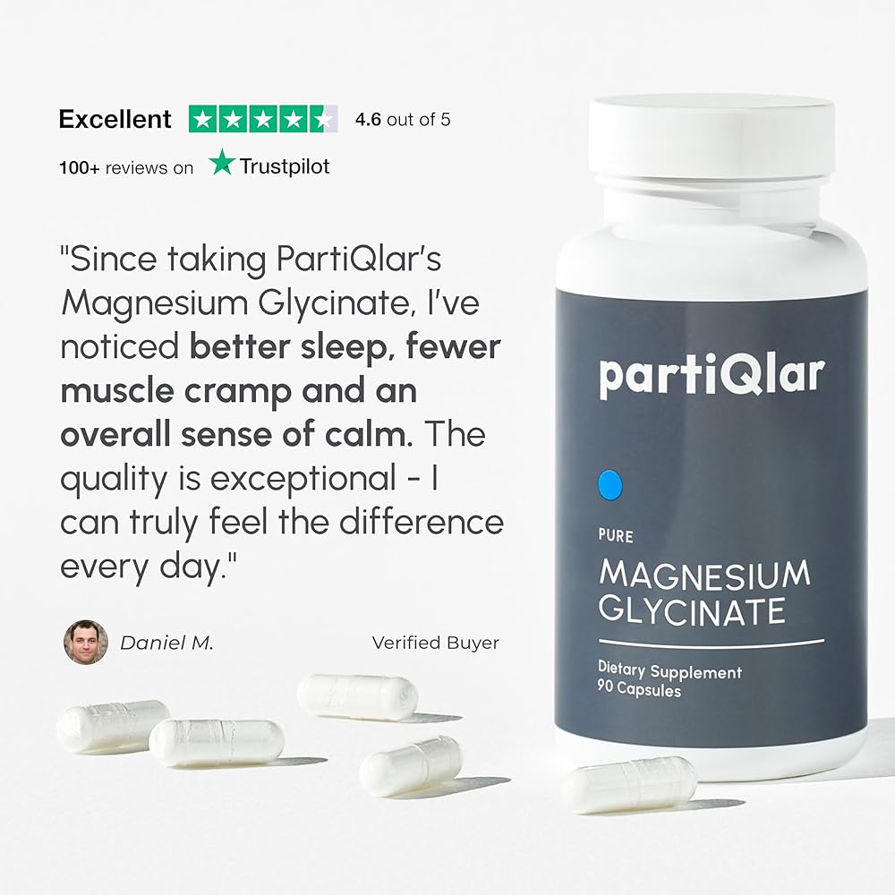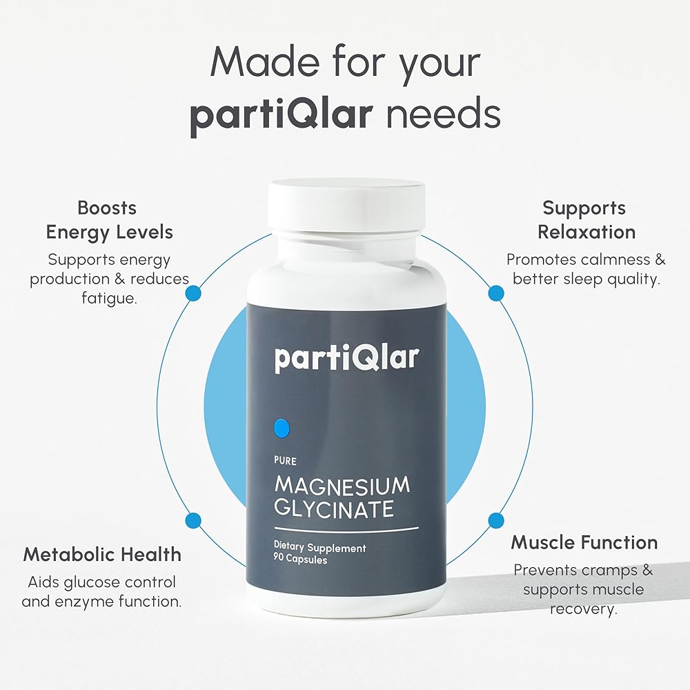 Experience the total-body benefits of Partiqlar Magnesium Glycinate 200mg. As a vital mineral involved in over 300 enzymatic reactions, magnesium is essential for your heart health, bone density, and nervous system function. The Superior Bisglycinate Difference Not all magnesium is created equal. We use a Chelated Bisglycinate form, which is more stable and better absorbed by the human body. This allows for maximum efficacy in supporting muscle recovery and stress management without the digestive discomfort common in lower-quality oxide or citrate supplements. Key Benefits: Stress & Relaxation: Helps regulate the body's stress response and promotes a calm mood. Heart & Bone Health: Supports cardiovascular integrity and healthy bone mineralization. Sleep Quality: Assists in maintaining a calm brain and body for a restorative night's rest. Our 60 veggie capsules provide a clean, potent, and science-backed way to replenish your magnesium levels. Choose Partiqlar for a Magnesium Glycinate 200mg supplement that is as effective as it is gentle on your body.