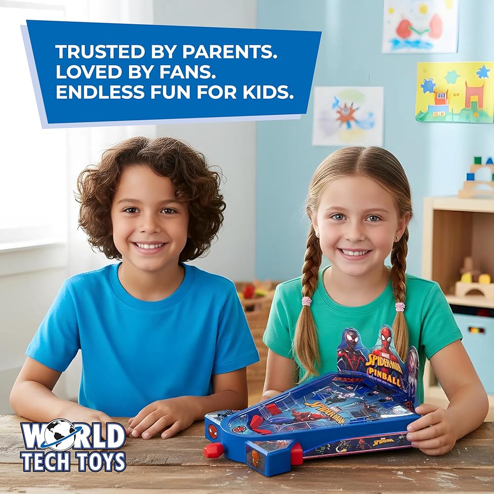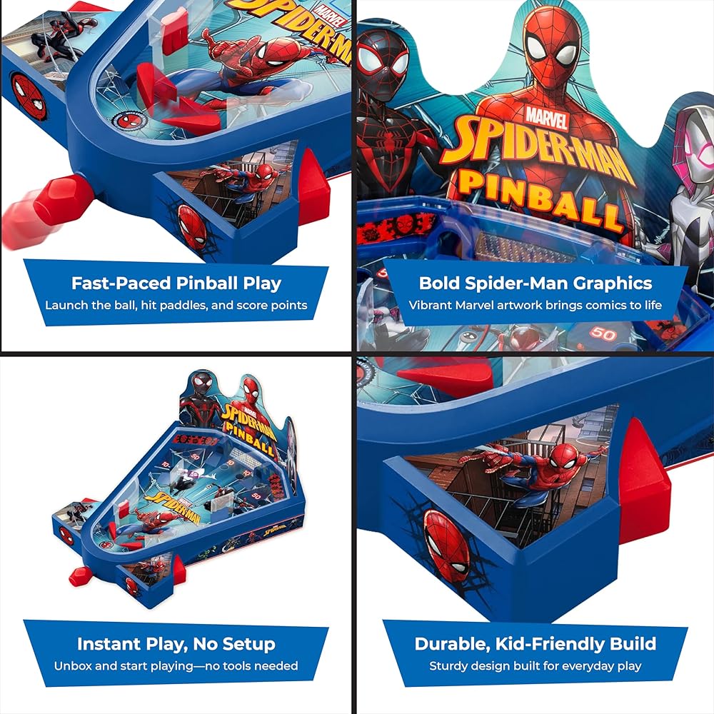 World Tech Toys Marvel Spider-Man Tabletop Pinball Game – Kids Mini Arcade Toy with Launcher & Metal Ball - Marvel Licensed - Spiderman Gift for Ages 3+