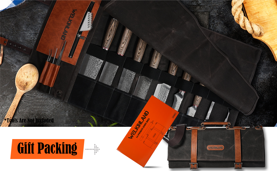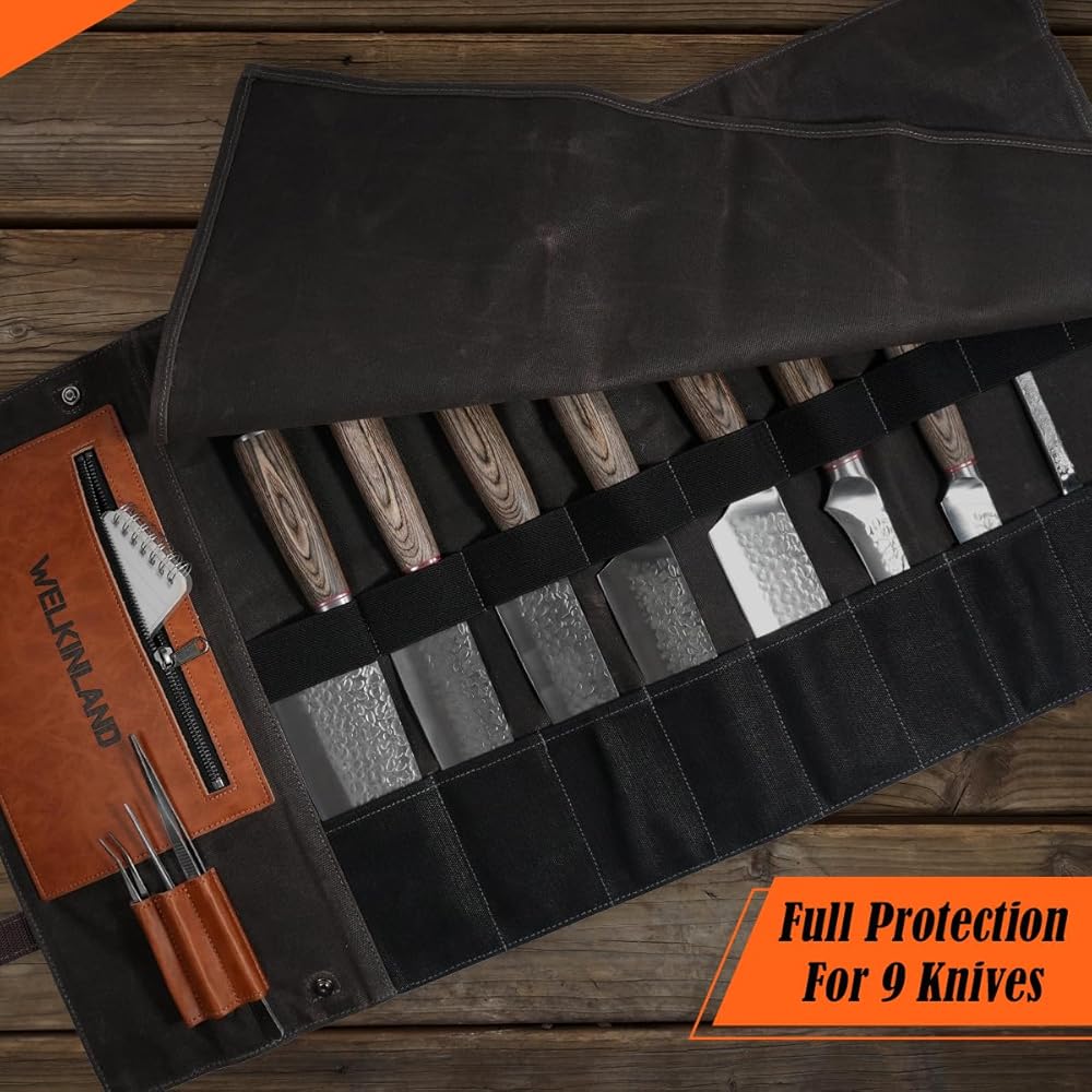 WELKINLAND 13-Pocket Knife Roll, Waxed-Canvas Leather Knife Roll Bag, Heavy-Duty Chef Knife Roll Bag, WaterProof Knife Wrap Roll, Portable Chef Knife Roll Up, Chef Knife Bags And Rolls