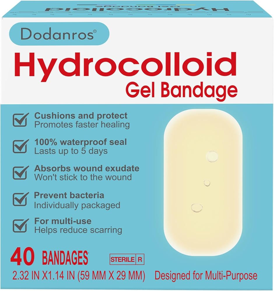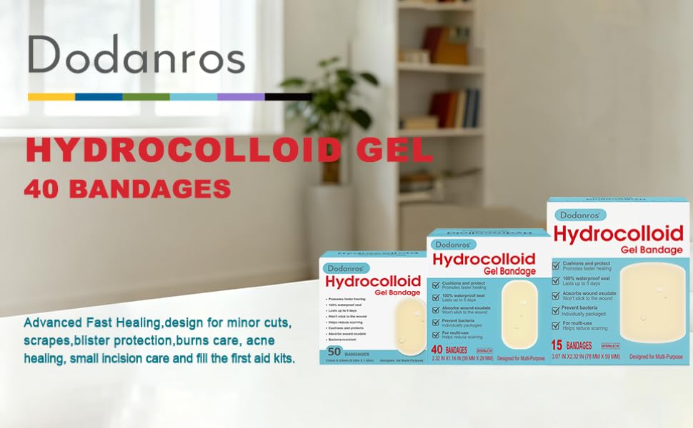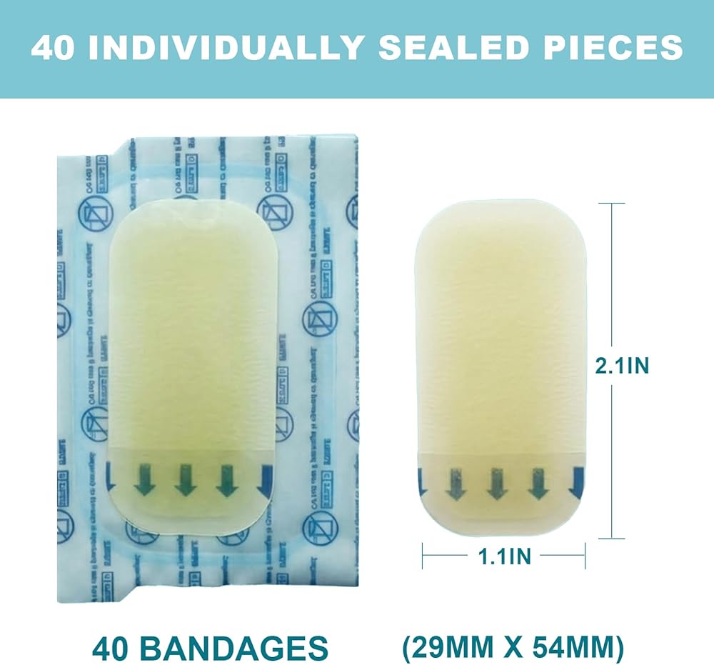 40 count value pack, 2.32*1.14 in, individually wrapped hydro gel bandages,Suitable for various small to medium-sized cuts, scrapes, Blisters,burns, acne, bruises,and for fill your first aid kit.It can also be used as daily cushioning and protection for the feet, suitable for all kinds of blisters on the feet.