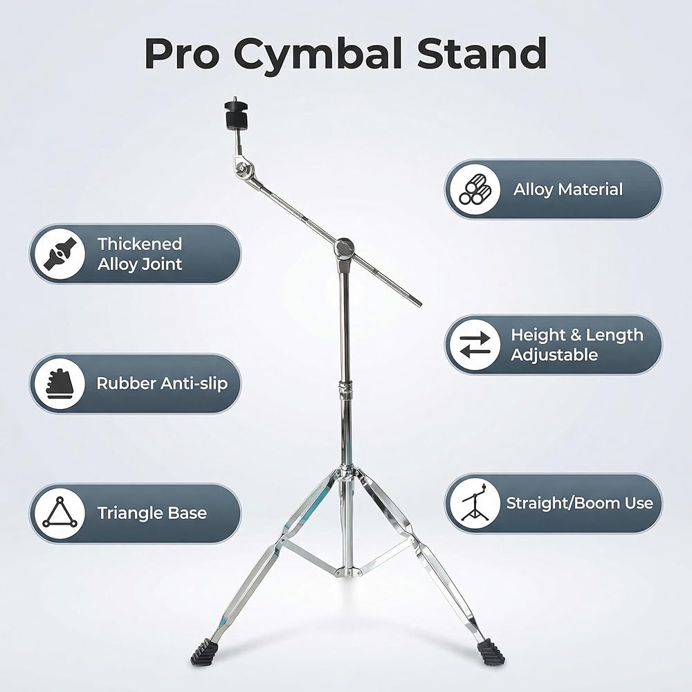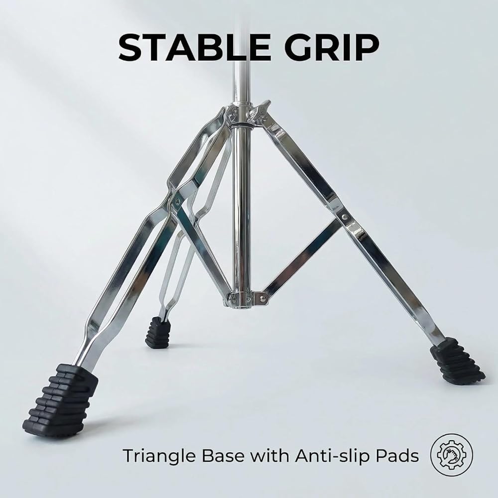 This professional adjustable straight cymbal stand is built with heavy‑gauge chrome steel for long‑lasting durability and rust resistance. Double‑braced legs and non‑slip rubber feet deliver stable, wobble‑free performance on any floor surface. With tool‑free height adjustment from 27.5” to 52.7”, you can easily set your ideal playing position. It fits all standard ride, crash, and splash cymbals, assembles quickly, and is lightweight for practice, studio, gigs, and touring. Suitable for drummers from beginners to professionals, it's a reliable and essential piece of drum hardware. Ideal for beginners, novices, and amateur drummers