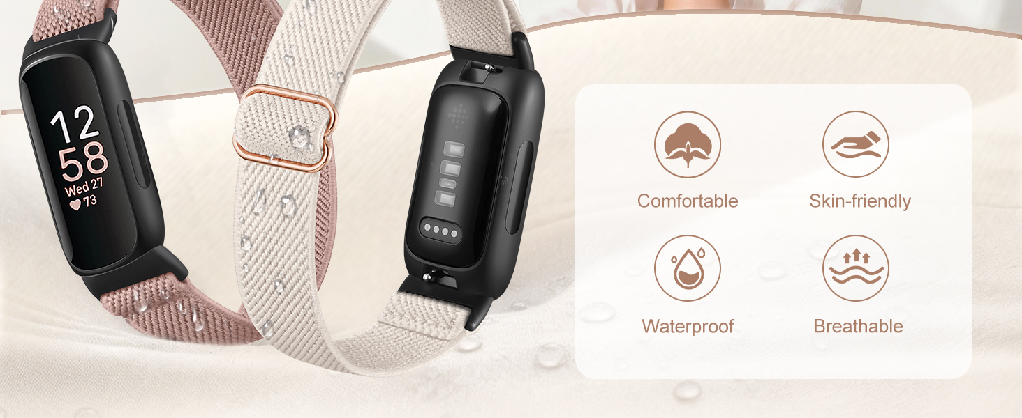 【Water Resistant】Our waterproof elastic bands compatible with Fitbit inspire 3 bands feature advanced waterproof coating technology, effectively preventing the penetration of water, sweat, light rain, or splashes. Even if exposed to certain spills, such as coffee, you can simply rinse it with water within one minute to clean the bands. You don't have to worry about moisture affecting the bands, making them suitable for various sports and leisure occasions