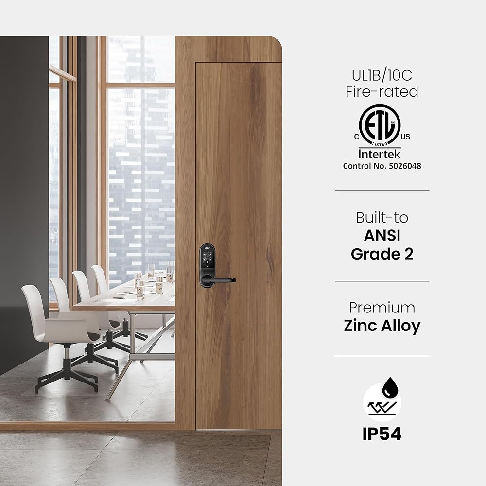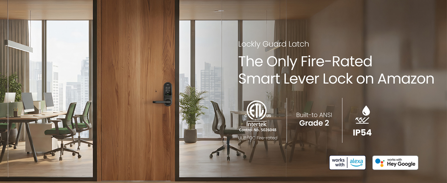 FIRE-RATED FOR COMMERCIAL DOORS (UL10B / UL10C CERTIFIED): Install with confidence on fire-rated doors — the Lockly Guard Latch meets UL10B, UL10C, NFPA 252, and FBC fire door standards that conventional smart locks can't. IP54 weatherproof and ADA compliant.