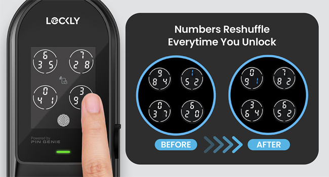 HACK-PROOF PIN ENTRY — PATENTED PIN GENIE TOUCHSCREEN: Digits shuffle after every use, so even if someone watches you type, they can't guess your code. Assign up to 49 unique codes to employees, guests, and contractors via the Lockly app — revoke access instantly when needed.