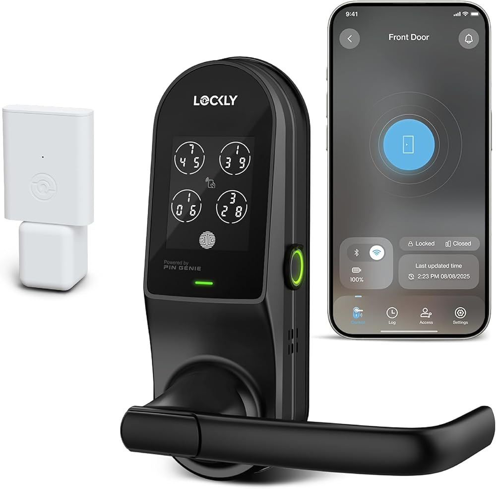 CREDENTIALS FOR HUNDREDS — FINGERPRINT, RFID & MORE: 3D fingerprint sensor stores 99 fingerprints. MIFARE RFID reader supports up to 999 encrypted cards and fobs with a LocklyOS subscription — far more than any competing smart lever. Plus Offline Access Codes, eKeys, and eBadges.