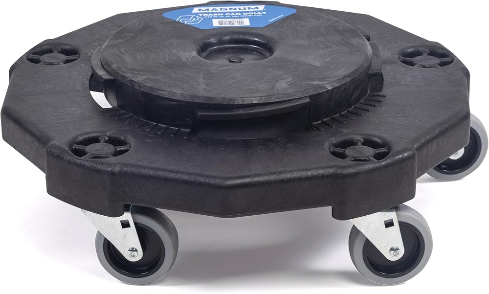 Our Heavy Duty Universal Fit Trash Can Dollies are designed with the same Twist On/Off Twist Lock feature that has become the industry standard among round can rollers and waste baskets with wheels, but the MAGNUM trash can dolly is sturdier and able to provide a much more secure and snug fit, and the MAGNUM dollies features no exposed metal on the top side, so it will not scratch or wear out the bottom side of trash cans each time they are disconnected or reconnected to the dolly.