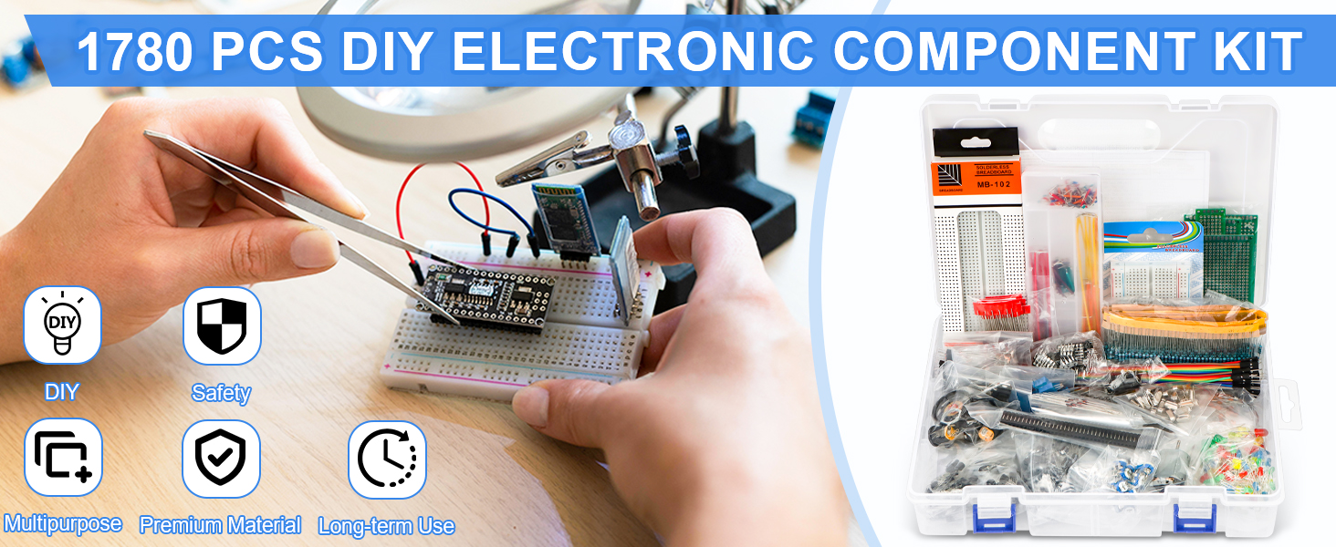 【COMPLETE VARIETY & SUFFICIENT QUANTITY】 Our 1780 pcs electronic component kit includes 600 metal film resistors, 120 electrolytic capacitor, 104 led diodes, 180 transistors, 300 ceramic capacitors, 100 diodes, 60 dupont wire, 2 breadboard, 140 breadboard jumper wires, 4 pcb board, 2 male to female headers connector, 70 diode kit, 14 trim potentiometer, 25 photoresistor, 7 crystal oscillator, 10 triode, 15 IC, 2 speaker, 6 DC power jacks, 2 buzzer, 3 switch, 1 motor, 13 adjustable resistor.