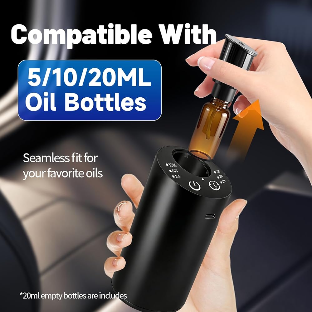 For Travelers, Campers & Business Trips: Hotel rooms smell like bleach? Rental cars feel stuffy? With a built-in rechargeable battery (48 hours cordless) and compact cylindrical design, this is the only waterless diffuser you need to pack. Works in hotel rooms, Airbnb, RVs, tents, or even on a cruise. No need to search for an outlet—charge once via Type-C (3.5 hours) and enjoy days of fragrance. Simply screw onto any standard 5/10/15/20mL oil bottle—no leaks, no spills in your luggage.