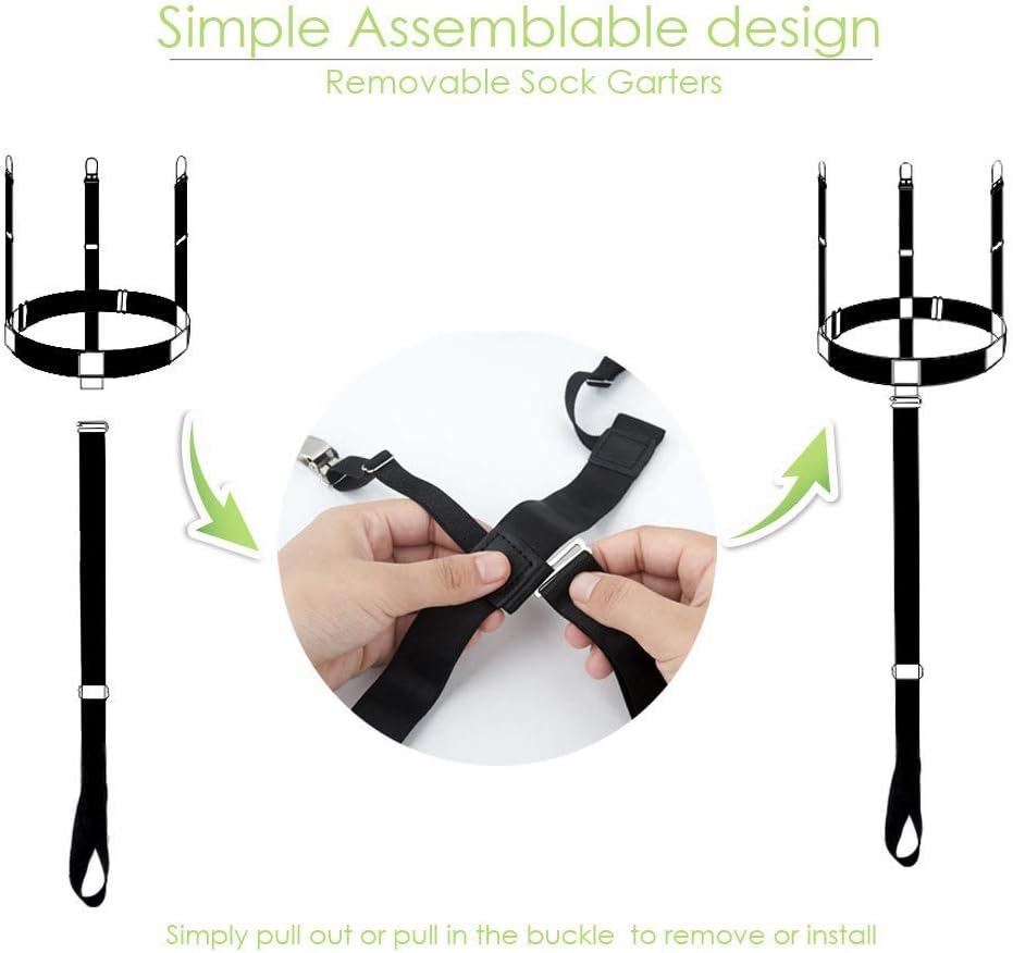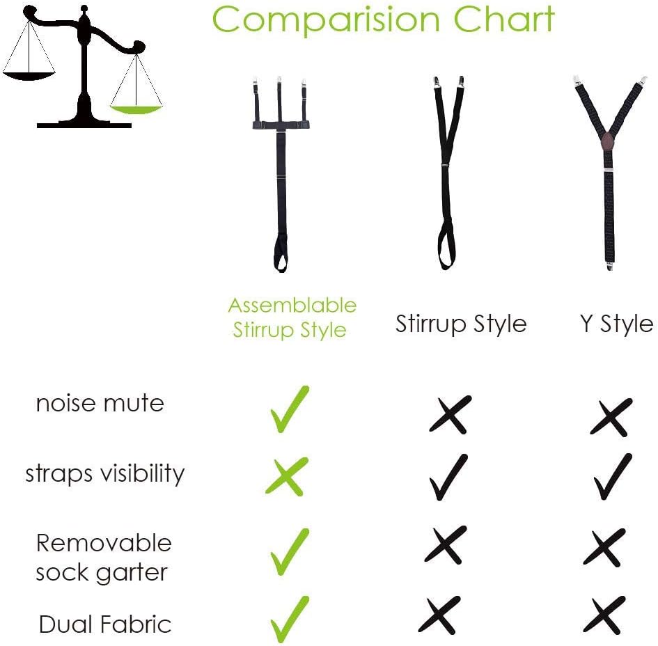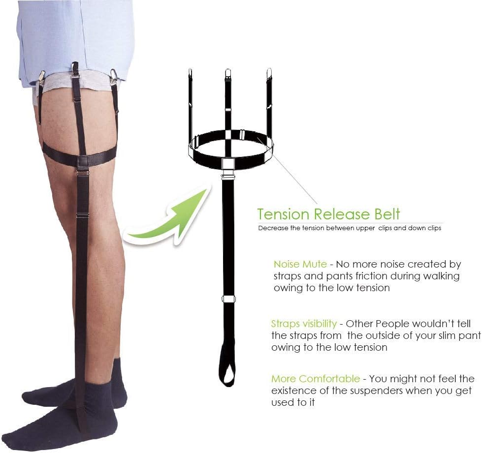 [Upgraded Ergonomics Trident Shirt Stays Design]We created a tension release belt at the middle part to keep your shirts tucked in and socks up all day long in a more comfortable way, so there is no more noise created by straps and pants friction during walking or suspender's visibility when you wear slim fit pant