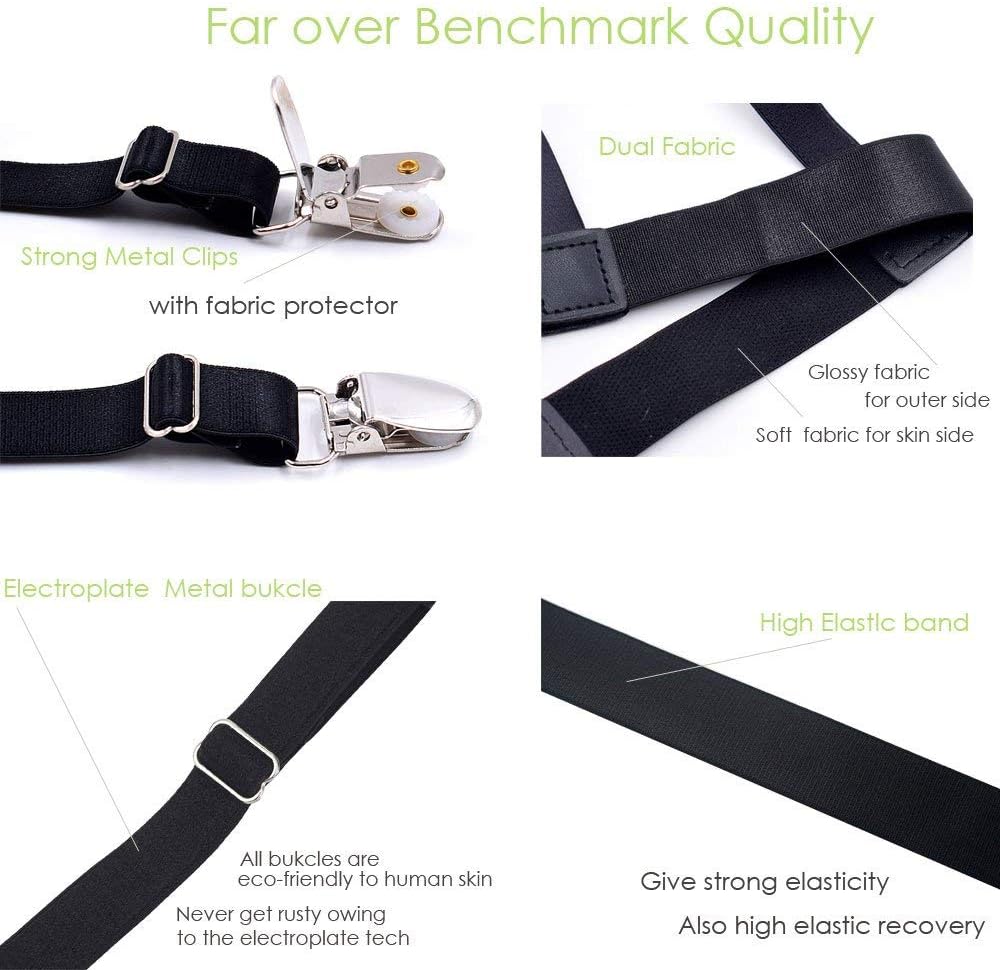 [Far over Benchmark Quality]We keep two main factors the best quality: Our solid and strong metal clips with fabric protector could provide you a whole day long shirts stay, and the band material is a combination of soft to the skin and enough elasticity during cycle usage