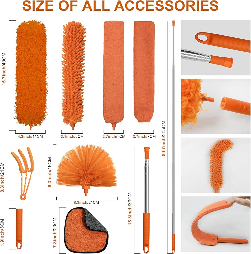 JEHONN Cobweb Duster with Extension Pole 96 inches, 8 PCS Extendable Long Handle Microfiber Feather Dust Remover, Telescoping Dusting Kit for Cleaning High Ceiling Fan, AC Vent House Exterior