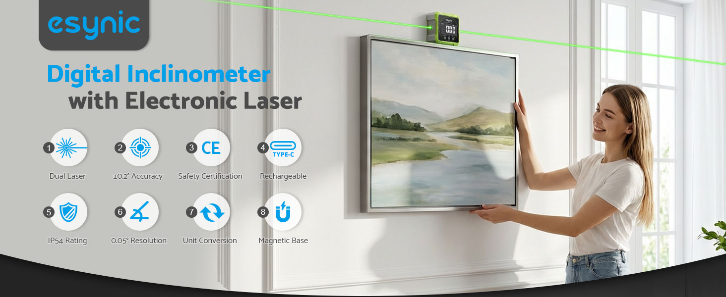 *🎯 【±0.1° Ultra Precision + 0.05° Resolution】*----:Our eSynic Digital Angle Finder Tool With Professional-grade Accuracy (±0.1° at 0°/90°, ±0.2° Otherwise) with 0.05°Resolution Detects micro-slopes.300% More Precise than Analog Levels—Perfect for Structural Inspections or HVAC Installations. (Laser Level Class II,Output: 0.51mW)