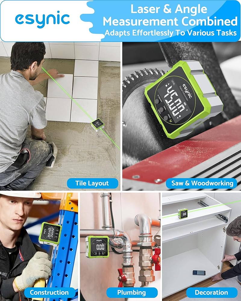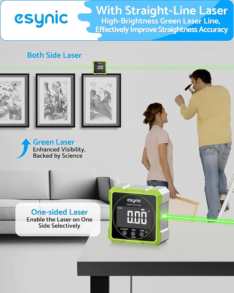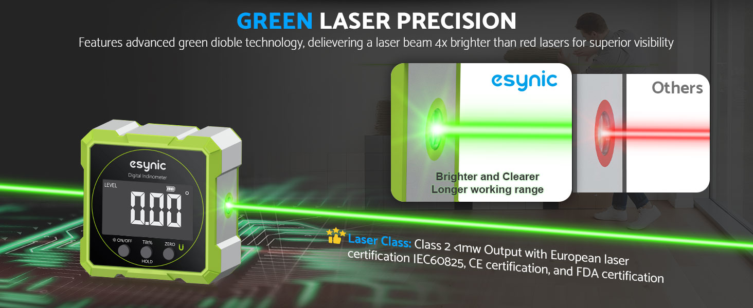 *⚡ 【Dual Lasers + Anti-Glare Display】*---:Our eSynic Professional Digital inclinometer Features Class 2 Lasers and a Large Backlit ScreenClear Display. Works in Pitch-black Tunnels or Direct sunlight—No More Squinting at Bubble Vials Like Old-school Levels! (Laser Level Class II,Output: 0.51mW)