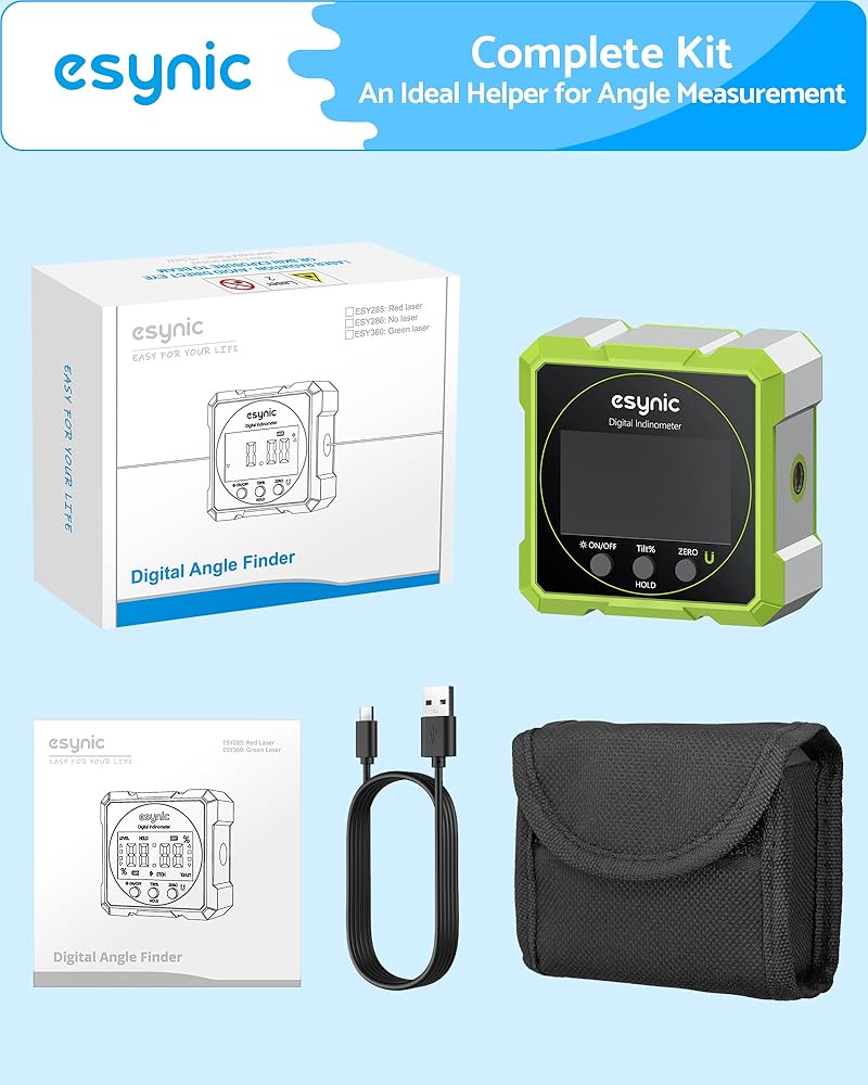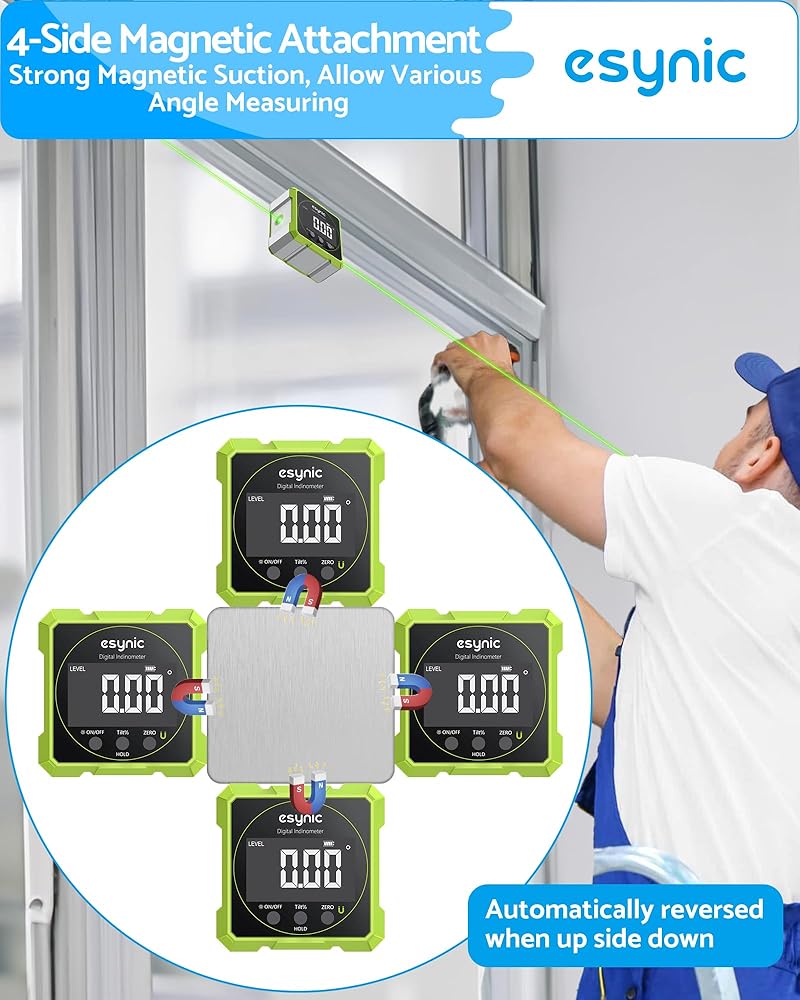 *🧲 【Aircraft-Grade Aluminum + 4-Way Magnets】*----: Our eSynic Digital Angle Finder is Made of Unbreakable Aluminum Frame Survives 5ft drops (tested!).4 Neodymium Magnets Stick to Steel Beams/Pipes for Hands-free use.IP54 Rated for Dusty/Rainy Job sites.(Laser Level Class II,Output: 0.51mW)