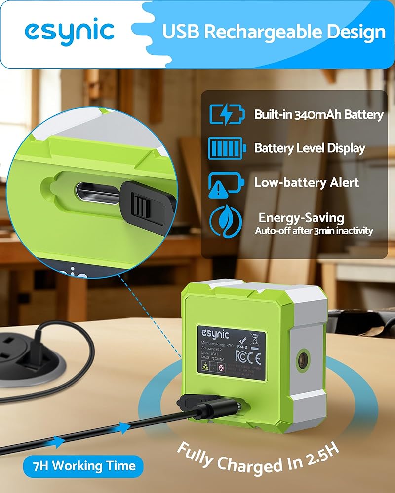 *🔋 【Type-C Fast Charge + 7H Runtime】*----:Our eSynic rechargeable digital level USB-C With 340mAh Battery Lasts a Full Shift (7 hours). Charges in 2.5hrs via Type-C (Power Bank Compatible). Auto Sleep Mode Prevents Dead Batteries Mid-job—Never Lose Data Again!(Laser Level Class II,Output: 0.51mW)