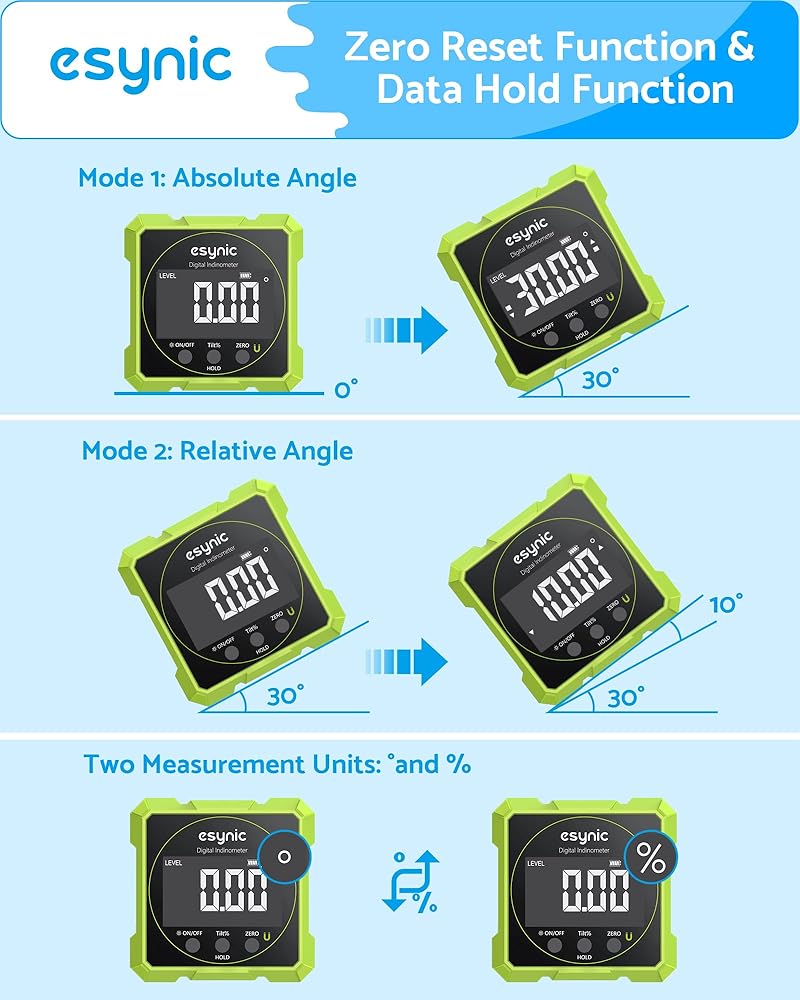 *📊 【Smart Hold Function + Unit Conversion】*----: Our eSynic Angle Gauge with Data Hold Freeze Measurements with one Tap! Switch Between °/% Units and Recalibrate Zero Points Instantly.Saves 50% Time on Multi-angle Welding or Stair Stringer Layouts(Laser Level Class II,Output: 0.51mW)