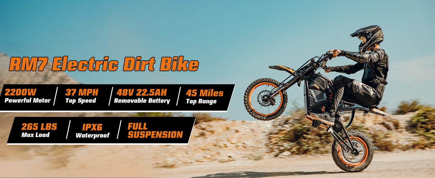 【2200W Peak Motor for Ultimate Speed & Performance】Experience unmatched power with the 2200W peak Mid-drive motor in RM7 electric dirt bike. Reach up to 37 MPH for an exhilarating ride and climb steep hills with ease, boasting a 60% slope of climb. (Note: Before purchasing, kindly review your local laws to check for any age or licensing requirements to ensure proper usage.)