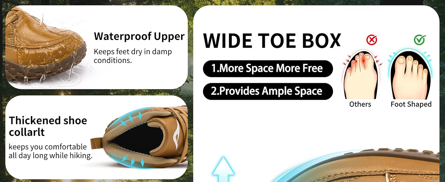 Water-Resistant Upper: The mens wide toe boots are equipped with soft PU leather upper and breathable lined, one pair handles city commutes, rainy sidewalks, and weekend trails without sweat or soak-through.
