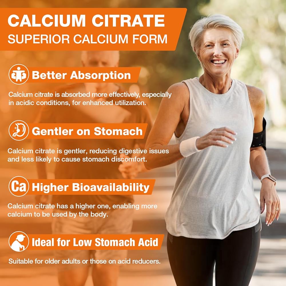 【High Absorption & Gentle on Stomach】Calcium citrate is highly bioavailable and easily absorbed. Unlike calcium carbonate, it doesn't require food or an acidic environment for absorption. Its digestive-friendly nature and the fact that it is gentle on the stomach make it perfect for long-term use, particularly for those with sensitive stomachs.
