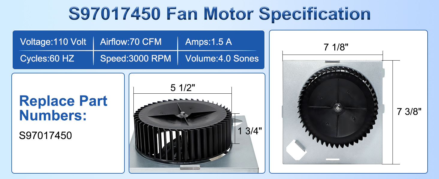 Upgrade your ventilation system: 70 CFM, Use our S97017450 exhaust fan motor to effectively and quickly expel the damp air and odors in the bathroom, quickly eliminate the fog on the mirror surface, ensure a fresh, well-ventilated and dry environment, improve the comfort after bathing and the overall indoor air quality