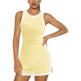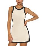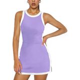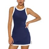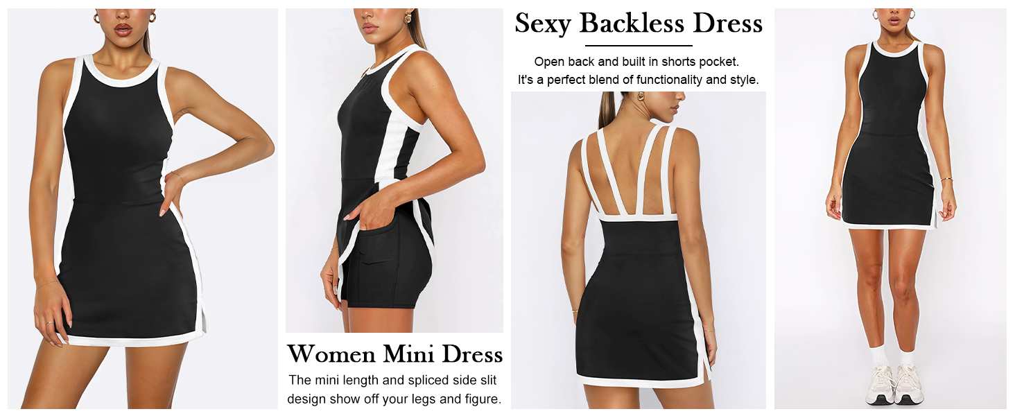 【Features】: Summer cute athletic dress features a classic crew neck, is sleeveless bodycon fit, splicing side, fixed straps, built-in pocket shorts and mini length.The sexy open back and fitted bodice create a flattering silhouette that accentuates your curves and highlights your waistline.