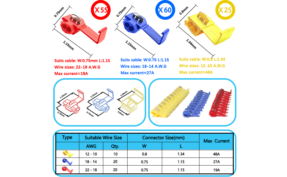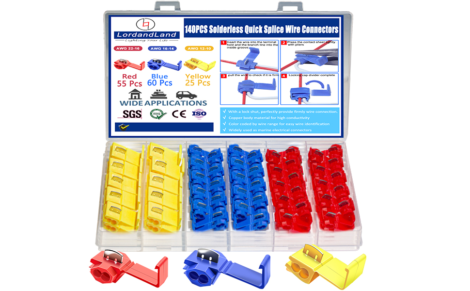 Package Included : 50PCS Solderless Quick Splice Wire Connectors, 22-10 AWG Lock Snap Electrical Wire Connector(22-18AWG Red 55PCS, 18-14AWG Blue 55PCS, 12-10AWG Yellow 30PCS)