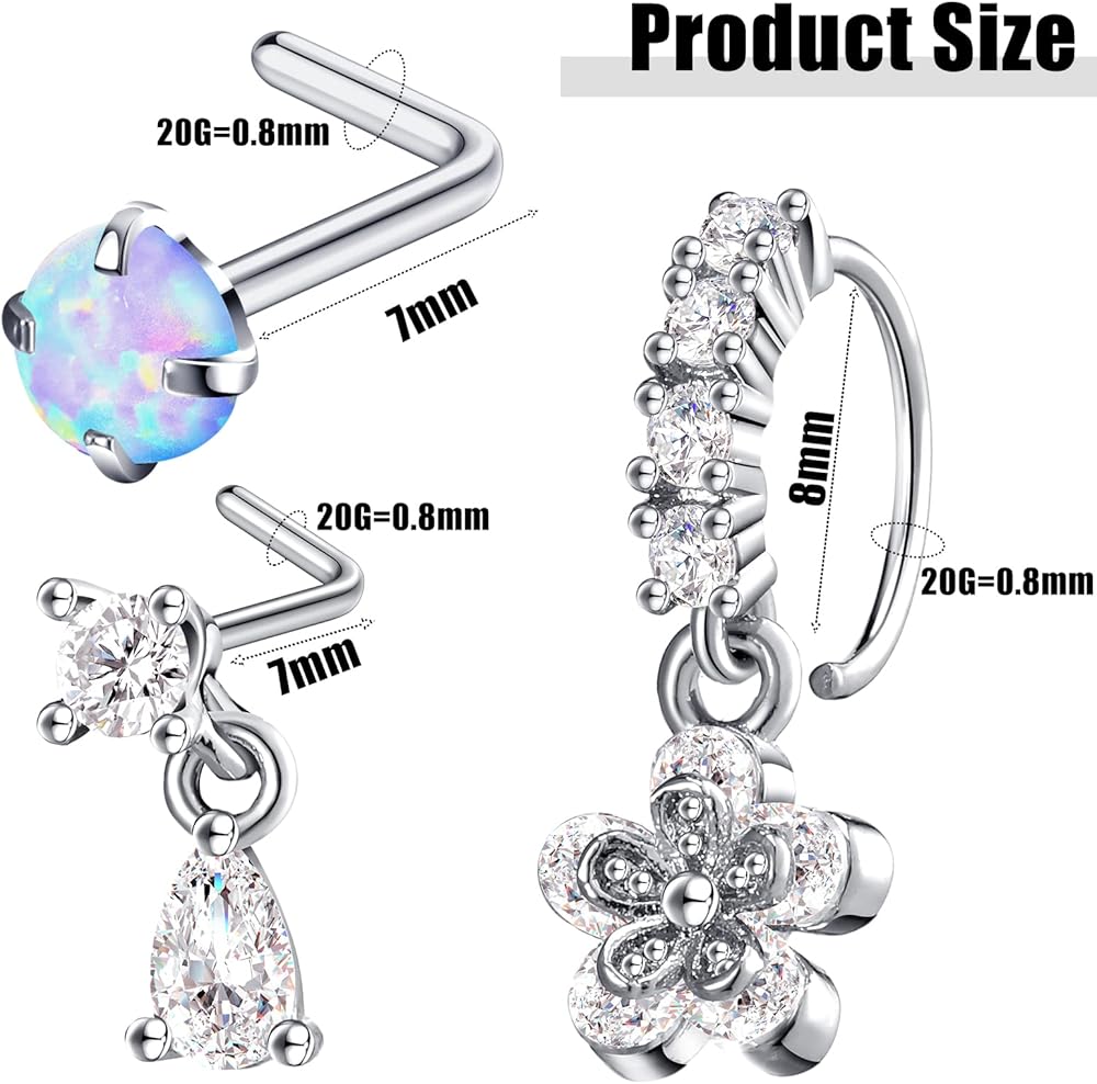 Detailed Size: the inner diameter of the round pendant nose ring is 8 mm and its thickness is 0.8 mm; The length of the jewelry bar of the L shaped stainless steel nose studs is 7 mm and its thickness is 0.8 mm, which is suitable for most people to wear