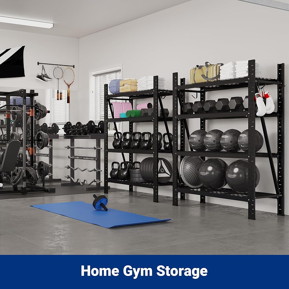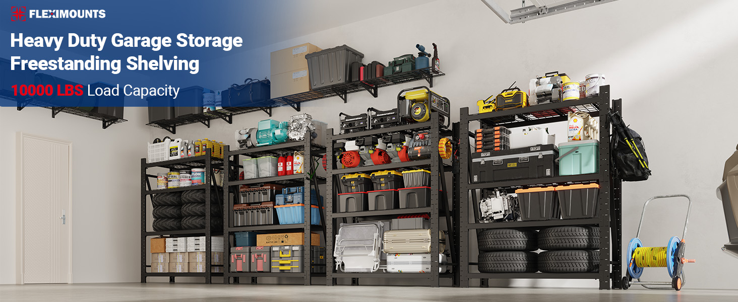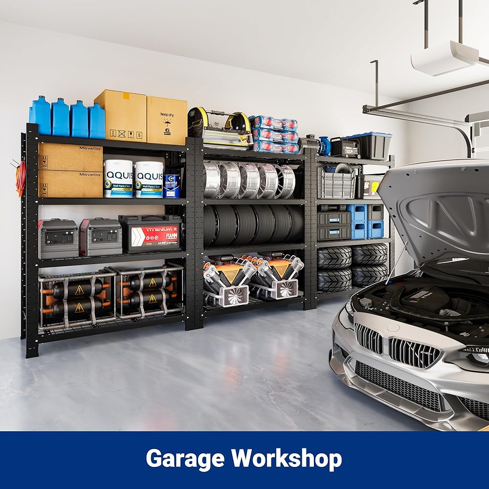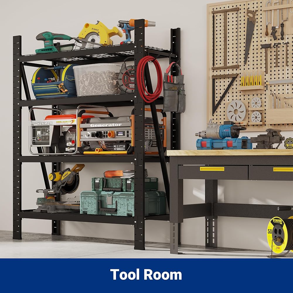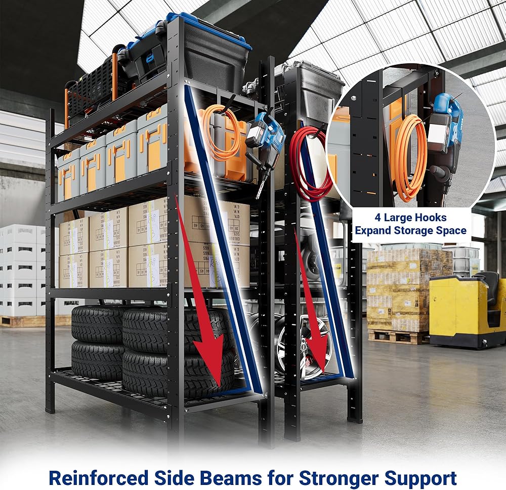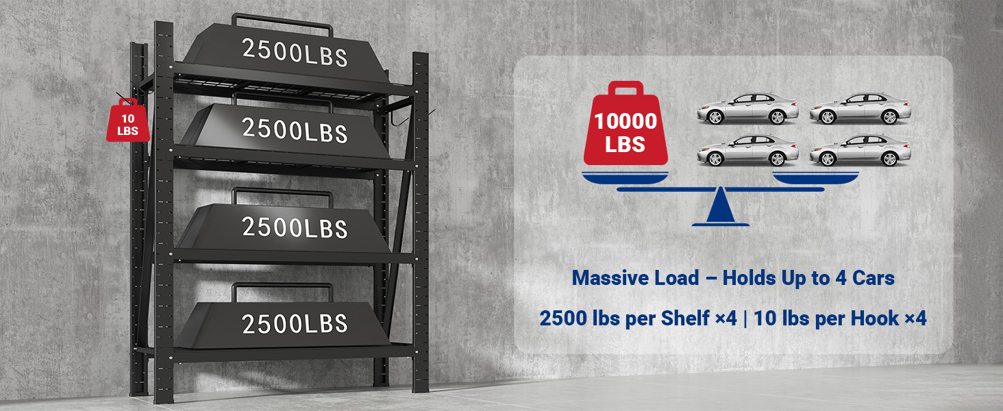 10000 lbs Load Capacity - The maximum capacity is up to 10000 lbs in total, with each shelf rated for 2500 lbs. The reinforced all-metal frame provides unmatched strength, easily supporting heavy tools, storage totes, and large equipment. For added convenience, this garage shelving unit also comes with 4 sturdy steel hooks (10 lbs each) to keep cords and small tools neatly organized