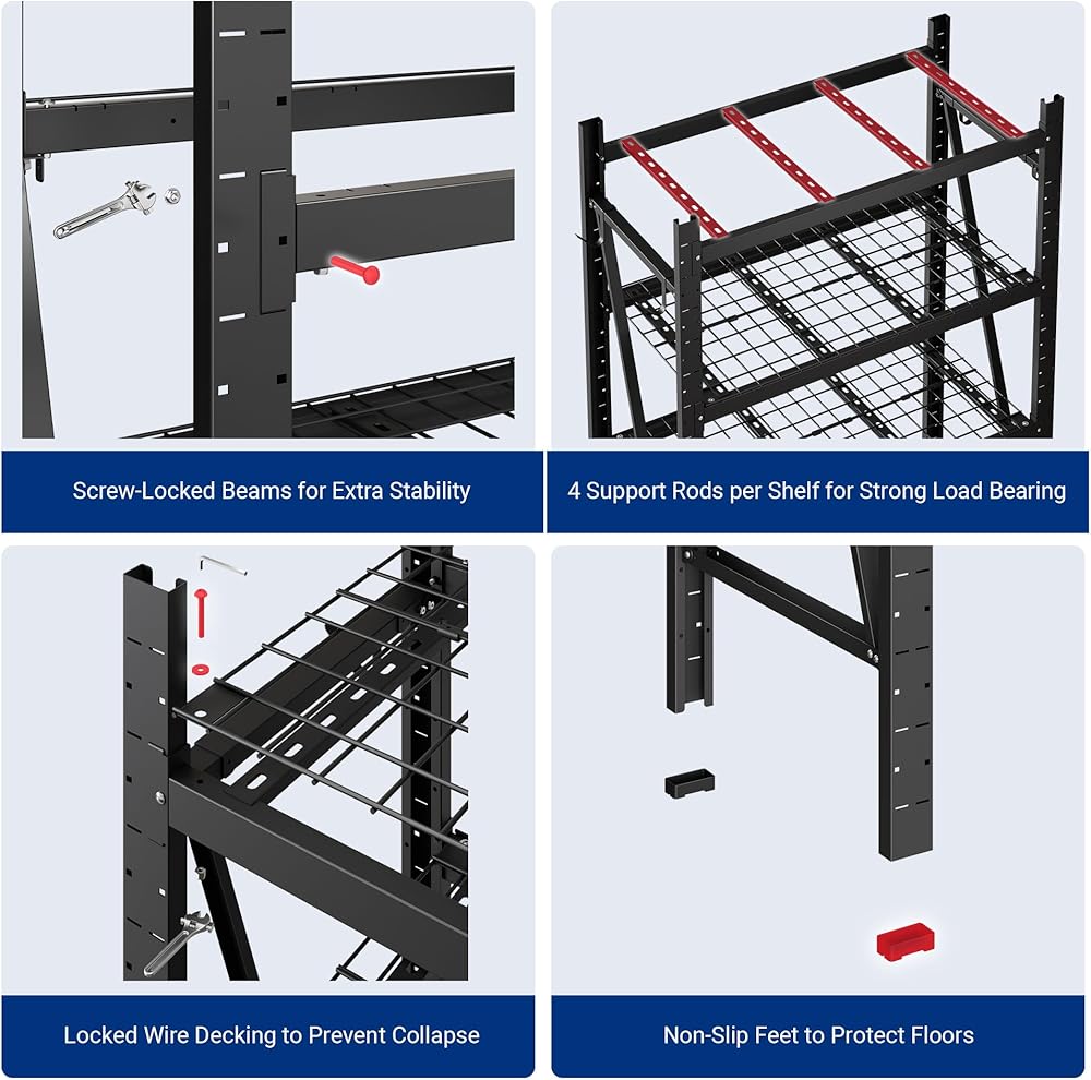 Reinforced for Superior Stability - Constructed with thick reinforced legs and screw-locked beams, this storage shelves deliver rock-solid support under heavy loads. Each shelf on these metal storage shelves is strengthened with 4 support rods and locked wire decking to prevent shifting, while non-slip feet add extra stability and protect floors from scratches