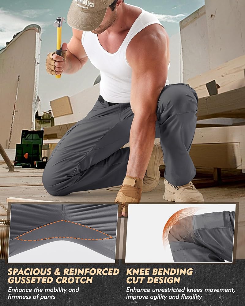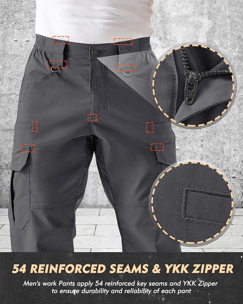 BUILT TO LAST & MAXIMUM MOBILITY - The articulated knees and gusseted crotch of tactical pants for men are engineered for maximum mobility, allowing you to squat, kneel, and climb without restriction and flexibly switch between different movement. Fortified every critical stress point with bar-tacked stitching at the pockets, crotch, belt loops, and knees, mens work pants ensure the durability after long-term use