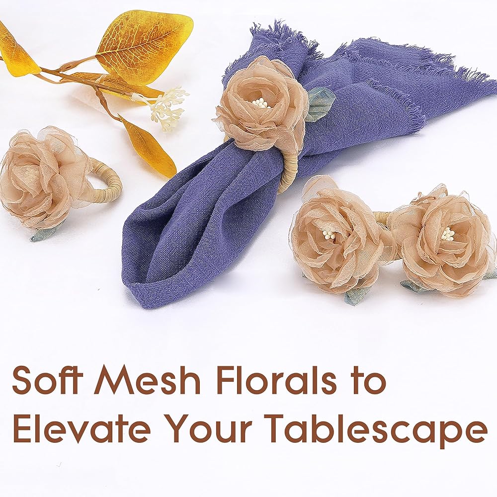 Add a calm, romantic floral touch to your dining table with this set of handcrafted camellia napkin rings.Each piece features layered tulle petals in soft blush-beige tones, paired with green leaves to create a natural, gentle look that blends seamlessly into: