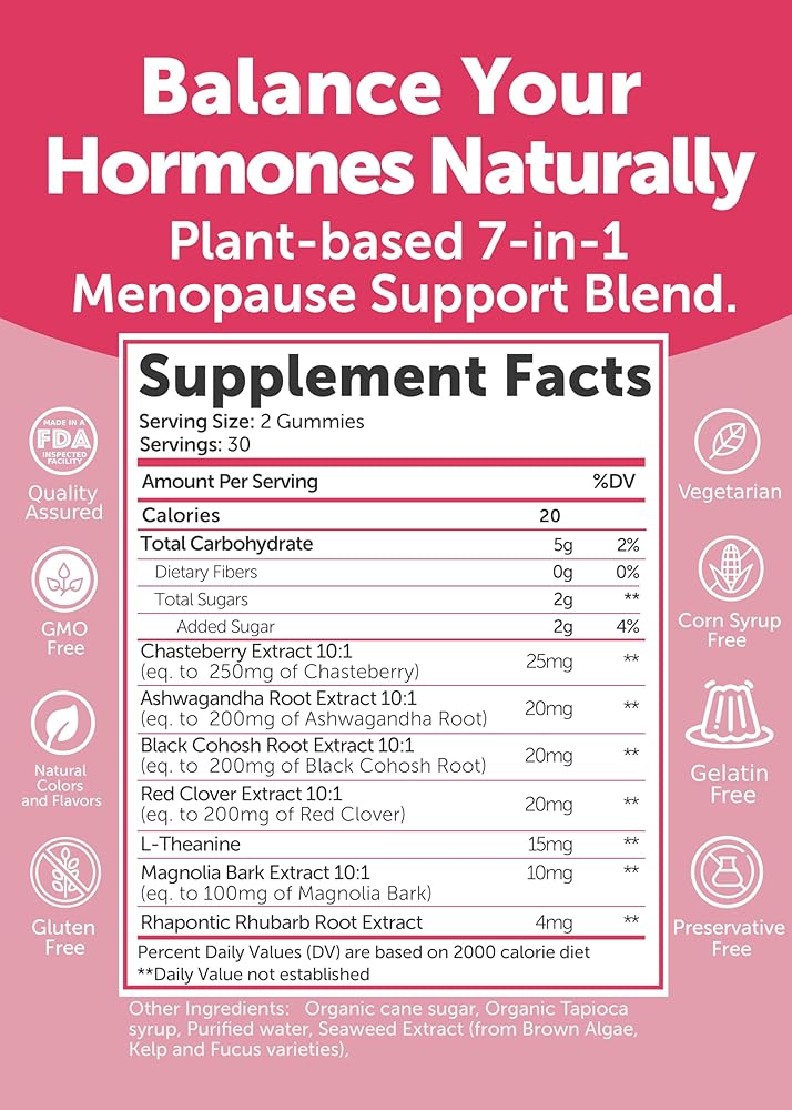 High-Potency Extracts – Uses 10:1 standardized herbal extracts for concentrated menopause support in every gummy, offering a focused and effective approach to hormone balance support.