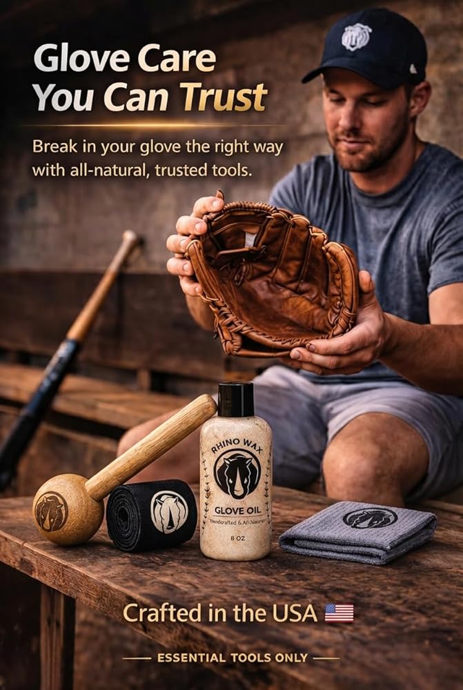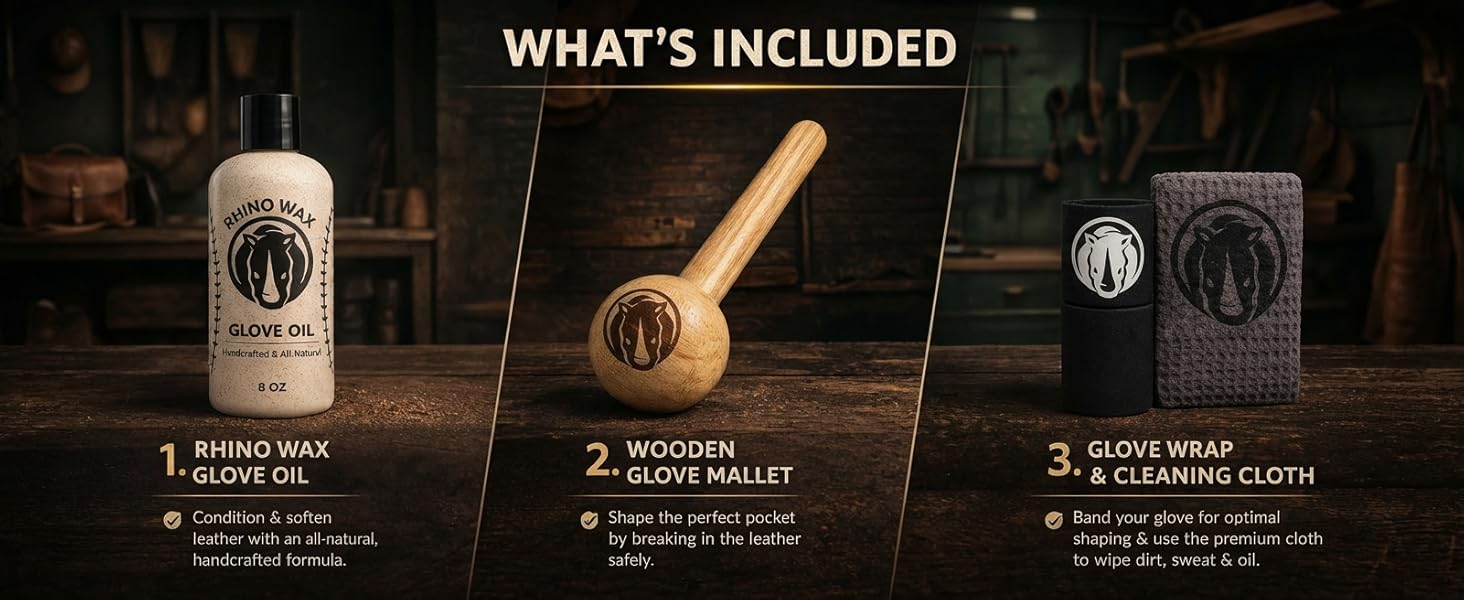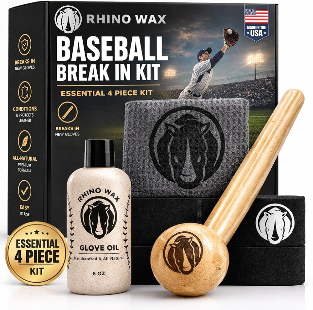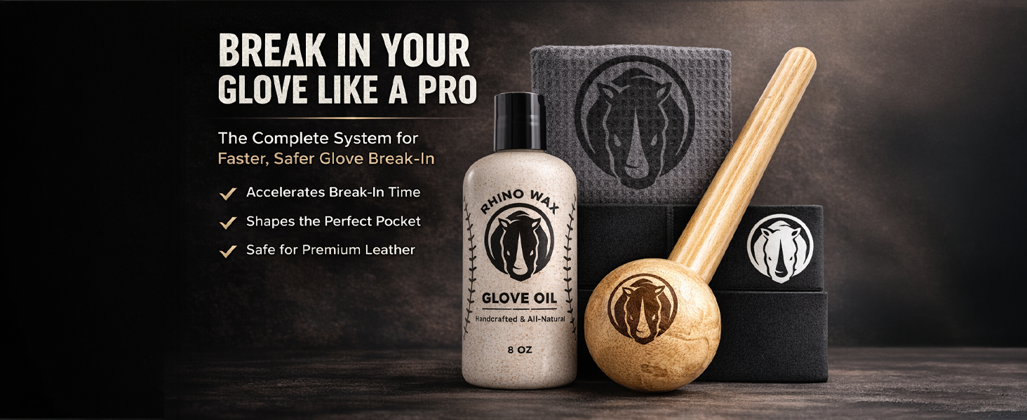 Rhino Wax - Baseball Glove Break-in Essentials Kit - Includes Premium Oil for Ball Gloves, Mallet for Breaking in, Shaping Wrap, and Microfiber Cloth - Everything to Get Your Glove Game Ready