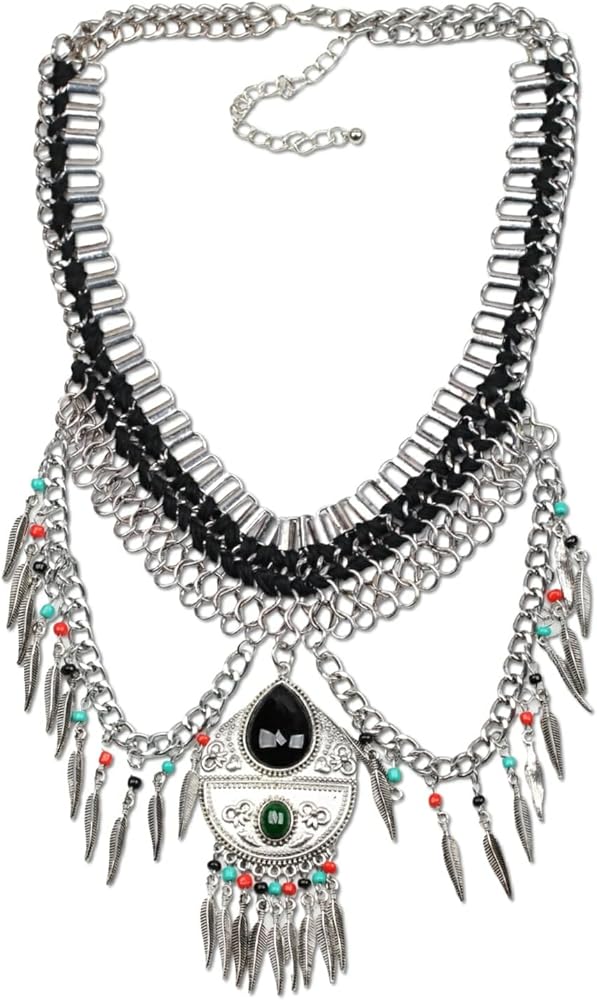 3. Make a statement with this unique pendant necklace that exudes vintage elegance. The intricate leaves and trendy tassel accentuate the wide chain, creating a bold and chunky look that is perfect for fashion-forward women. Crafted from high-quality alloy metal, this colorful bead jewelry adds a pop of color to any outfit, making it a versatile accessory for any occasion.