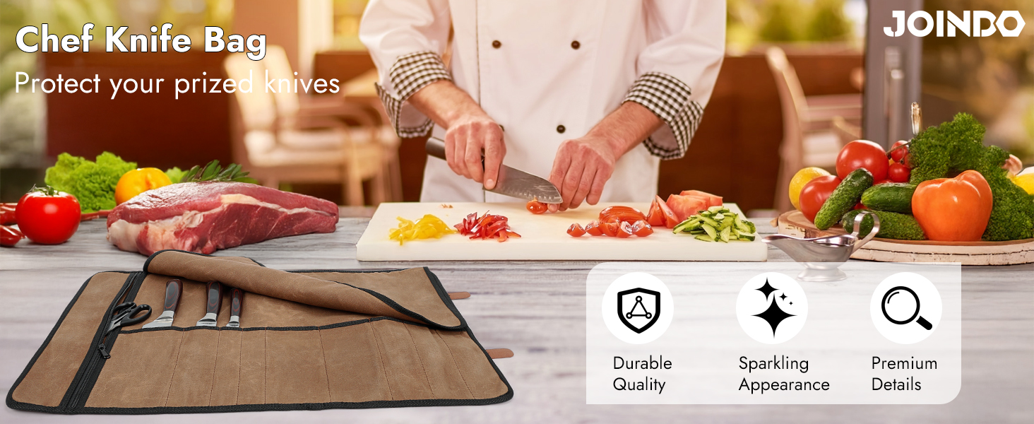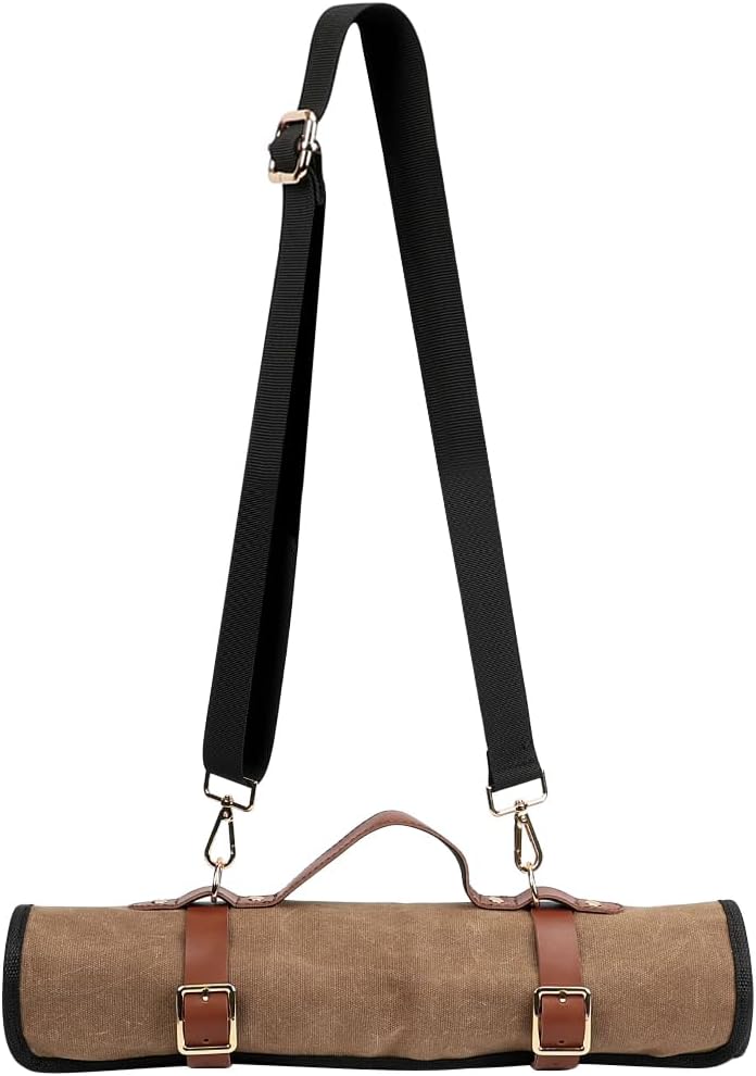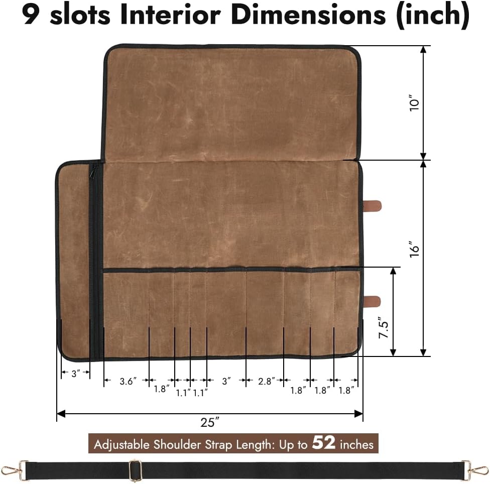 Size and Capacity: Measuring 16" high and 25" wide, this knife roll bag has 9 slots, each 7.5" deep and ranging from 1" to 4" wide. It fits many types of knives, perfect for professional chefs and outdoor cooking.