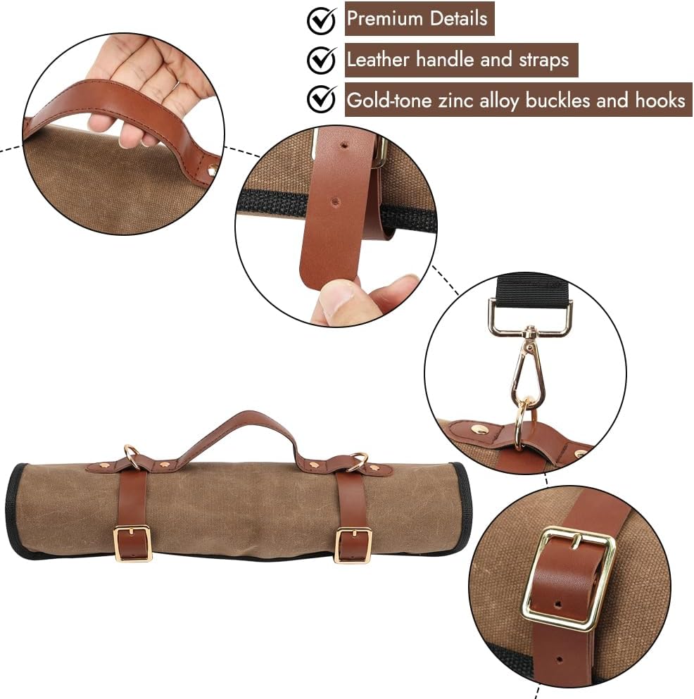 Premium Details: The handle and straps are made of leather. The buckles and rivets are crafted from zinc alloy with a gold-tone finish, adding great texture and enhancing the appearance of the knife bag.