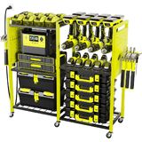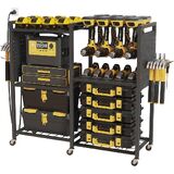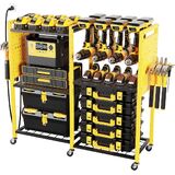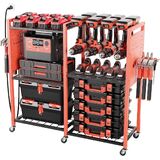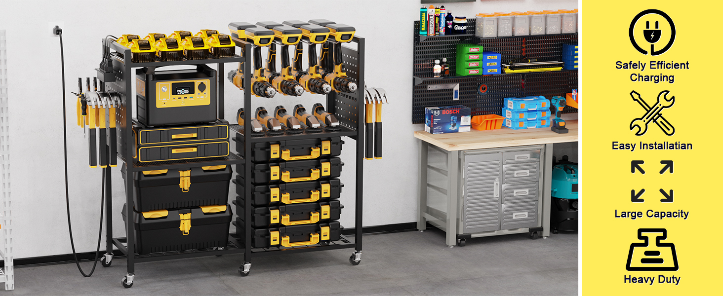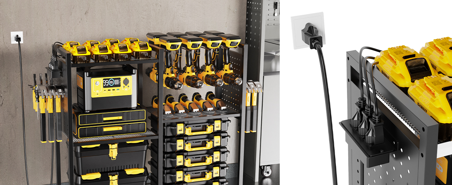 BUILT-IN 3-OUTLET CHARGING STATION: Power up to 3 tools simultaneously right on your power tool organizer cart! Features a secure power strip (125V/12A/1500W) with a 6.56ft cord, preventing over current, overcharging, or overheating. Never hunt for outlets again.
