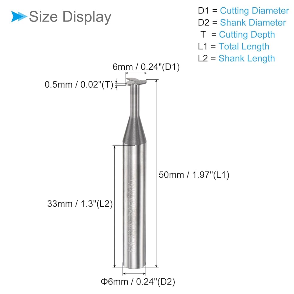 • ★ T Slot End Mill Size --- Cutting Diameter: 6mm / 0.24", Cutting Depth: 0.5mm / 0.02", Shank Diameter: 6mm / 0.24", Shank Length: 33mm / 1.3", Total Length: 50mm / 1.97", Number of Flutes: 3 Flutes. You will receive 1pcs T-slot end mill in 1 package.