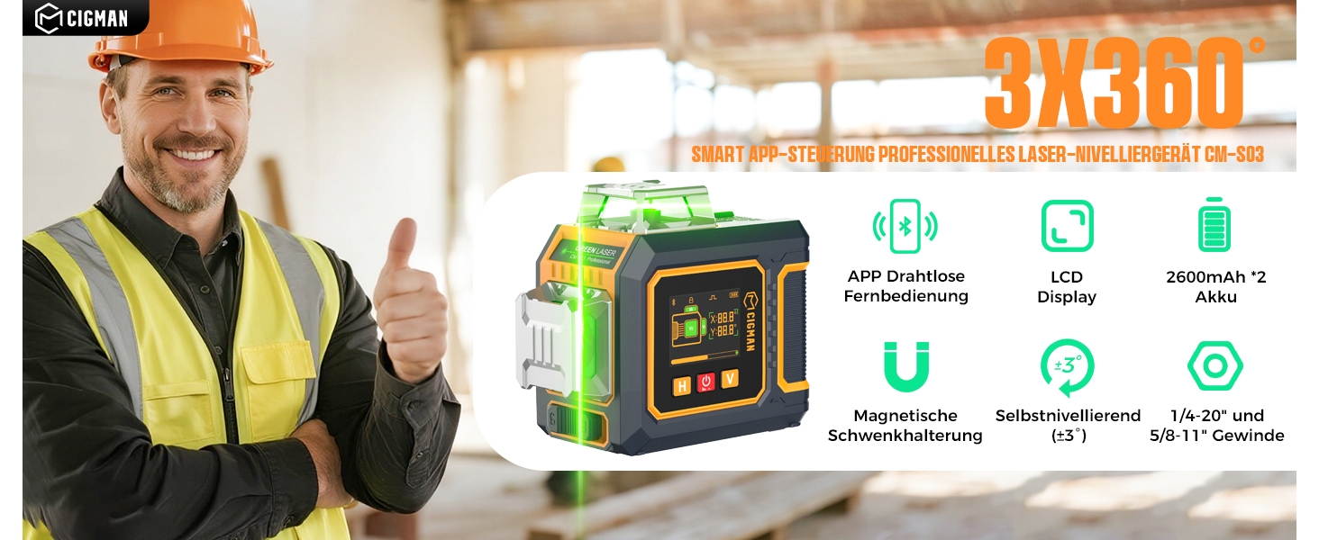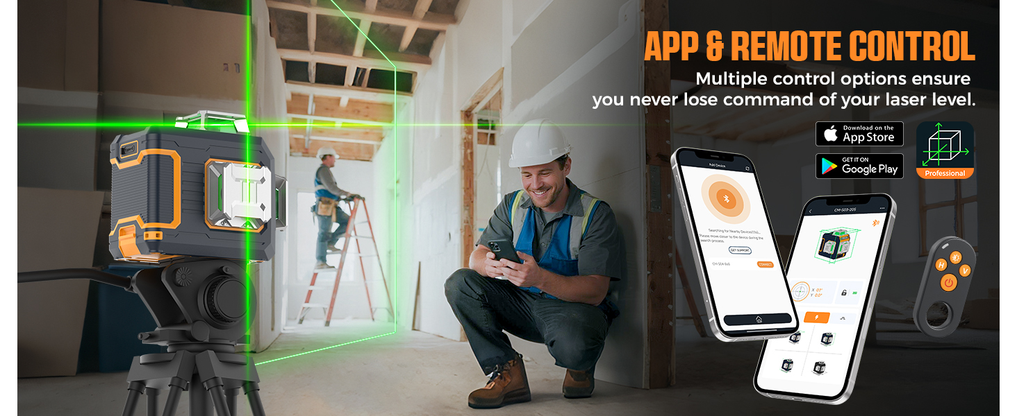 Side LCD & App Control: Large side LCD shows modes, leveling status and battery in real time; the lift bracket raises the beam to working height. Adjust lines and brightness via the Bluetooth app for iOS and Android or remote for hands-free, faster layouts