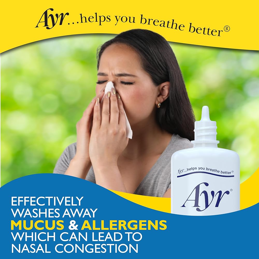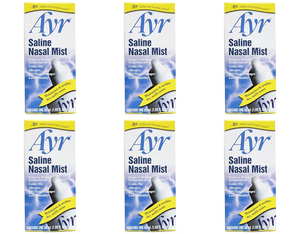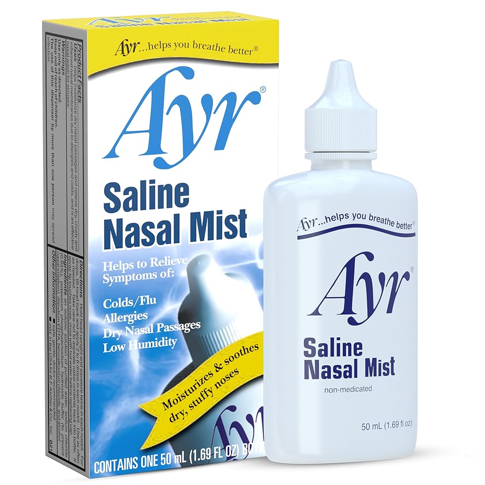 Ayr Saline Nasal Mist provides gentle, non-medicated relief for dry and irritated nasal passages caused by colds, allergies, low humidity, or environmental irritants. This isotonic saline solution helps moisturize and soothe dry, crusty, or inflamed nasal membranes while also assisting in flushing and cleansing the nasal passages and sinuses. Made with purified water and 0.65% sodium chloride, Ayr Nasal Mist is doctor-recommended, gluten-free, and safe for frequent use whenever nasal dryness or congestion occurs. The convenient spray bottle allows easy application to help restore moisture and comfort to dry, stuffy noses.