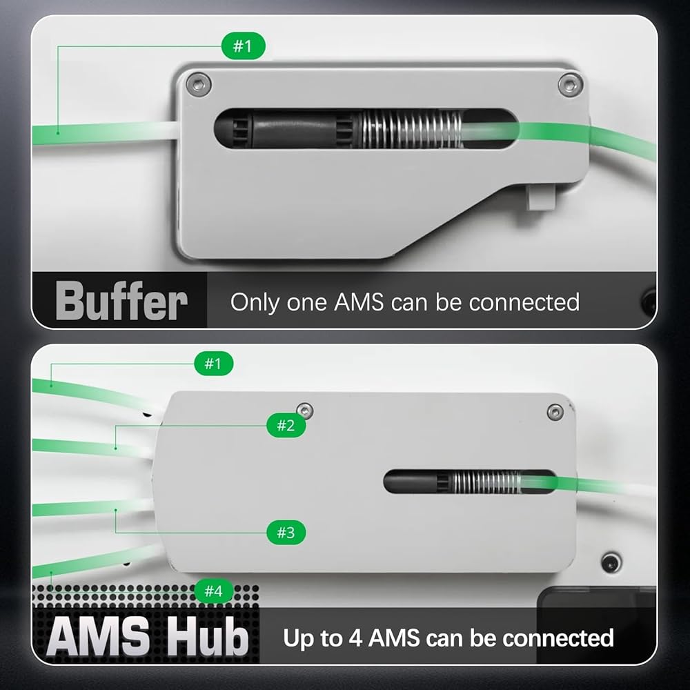 One equals four: The original filament buffer of the 3D printer can only connect to 1 AMS. After replacing it with the AMS Hub, the printer can connect to up to 4 AMS units.