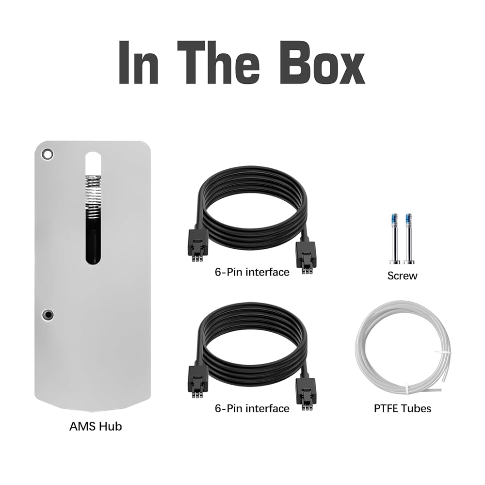 Original Product Includes: The Bambu AMS Hub includes the accessories needed to connect 2 AMS units to the printer. If you want to add more AMS units, you will need to order additional bus cables and PTFE tubes. To use 4 AMS units, you will need to order 2 additional bus cables (6-pin) and 2 x 2-meter PTFE tubes.