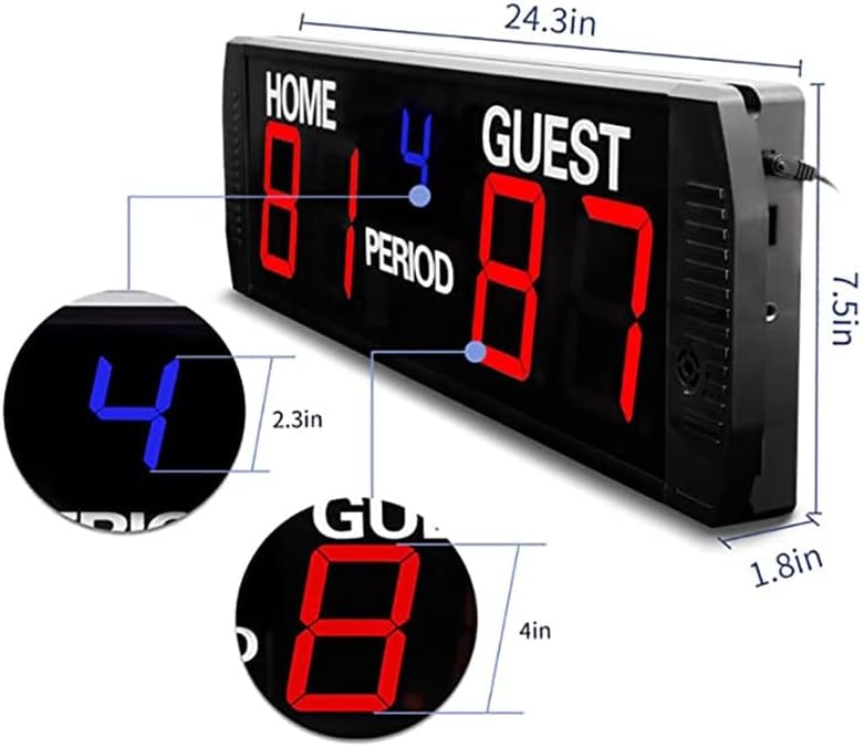 • HD DISPLAY: Comes with 4 &23 inch red led that you can see clearly from 66ft(20 meters) away. It have 5 levels brightness can be adjusted.This scoreboard was designed for indoor use only. Not advice for outdoor and not waterpoof
